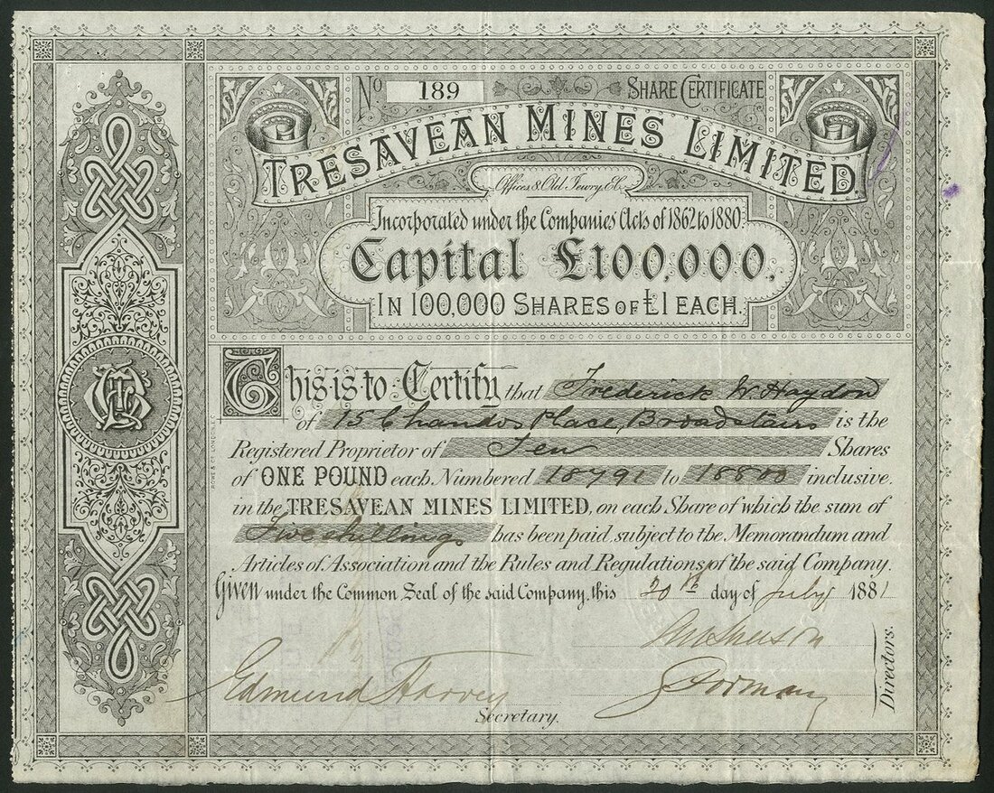 Great Britain: Tresavean Mines Ltd., £1 shares, 188[1], #189, very ornate printing, black. Mines in the Parish of Gwennap, Cornwall. GVF.