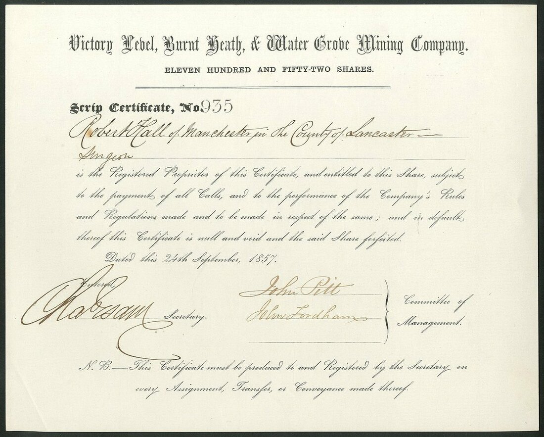 Great Britain: Victory Level, Burnt Heath & Water Grove Mining Company, scrip certificate for one share, 1857, #935, black. Lead mining in the Peak District, Derbyshire. EF.