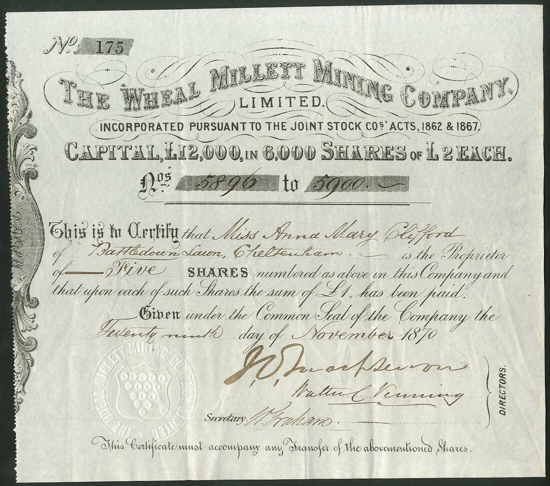Great Britain: Wheal Millett Mining Co. Ltd., £2 shares, 1870, #175, black with scrollwork. Based in Crowan, Cornwall. GVF.