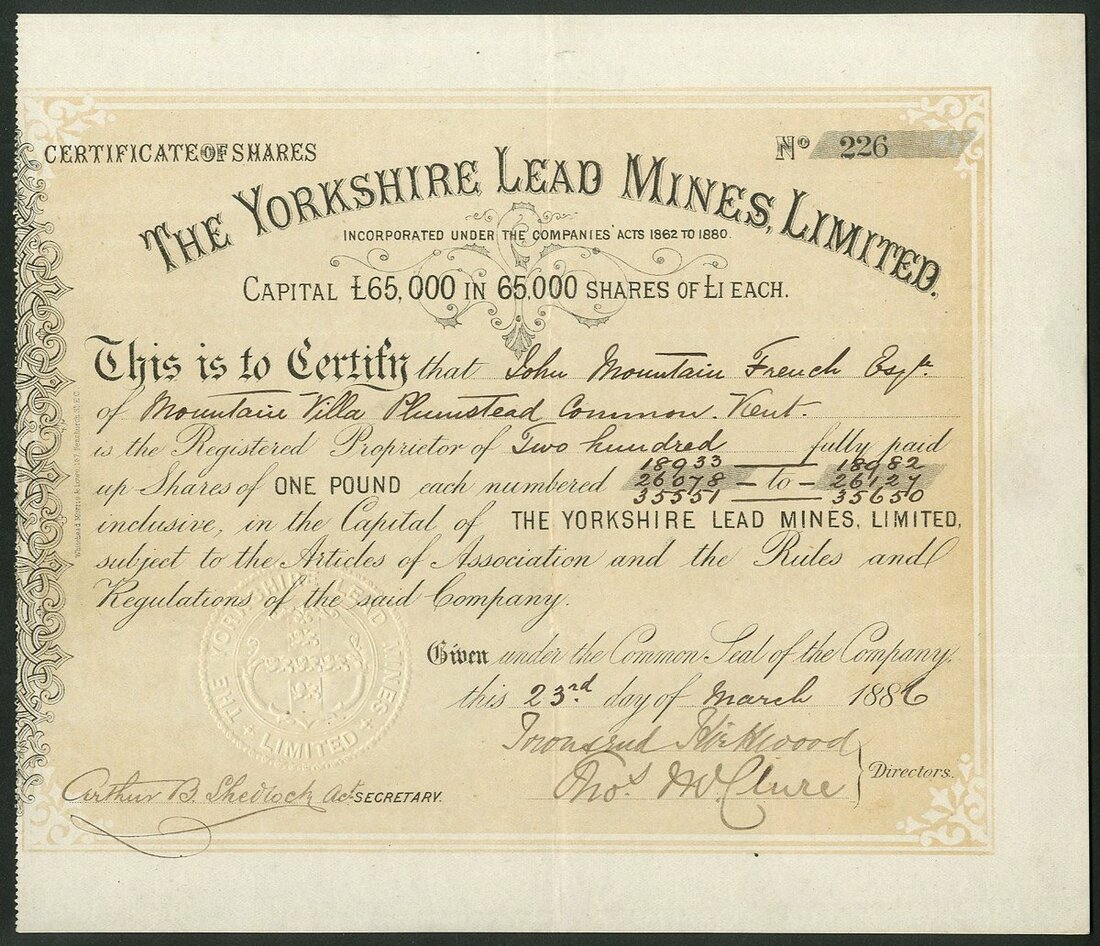 Great Britain: Yorkshire Lead Mines Ltd., certificate for £1 shares, 188[6], #226, scrollwork at left, black, yellow underprint. Acquired the Hurst Lead Mines in Swaledale. It was short lived and was taken over by the newly formed Hurst Lead Mines Ltd. in 1888. VF.