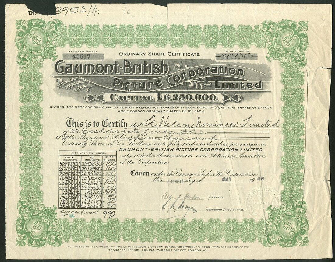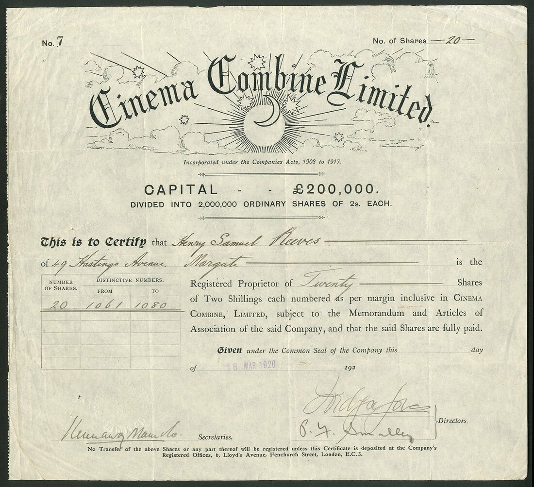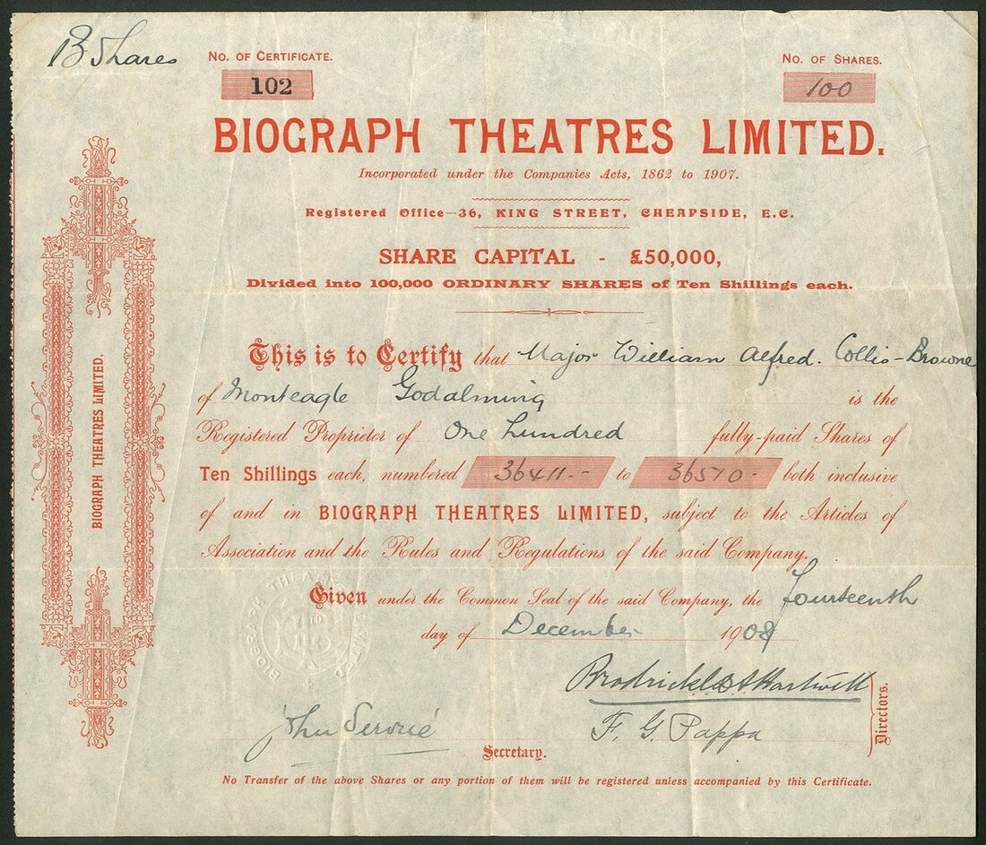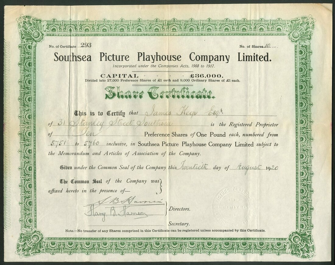 Great Britain: A collection of cinema and film companies, comprising Biograph Theatres Ltd., 19[08], #102; Southsea Picture Playhouse Co. Ltd., 19[20], #293; Dalry Victory Cinema Ltd., 19[28], #36; Cinema Combine Limited, 192[0], #7; Provincial Cinematograph Theatres Ltd., 192[0], #4490 with 4 page prospectus; Gaumont-British Picture Corporation Ltd., 19[48]; Portsmouth Theatres Ltd., 19[57], and, Kinemas Limited, 19[60]. Fine to Very Fine (9).
