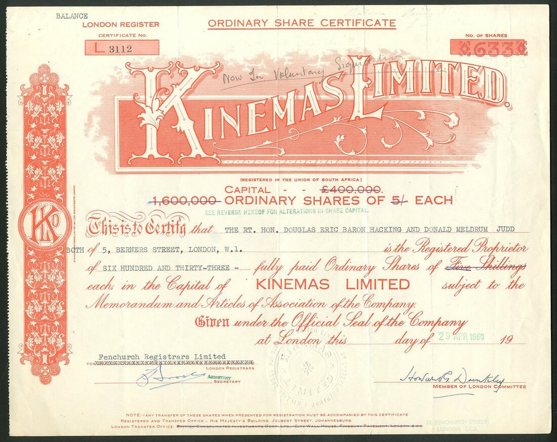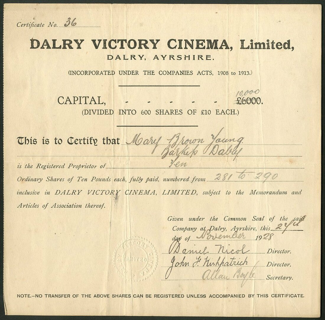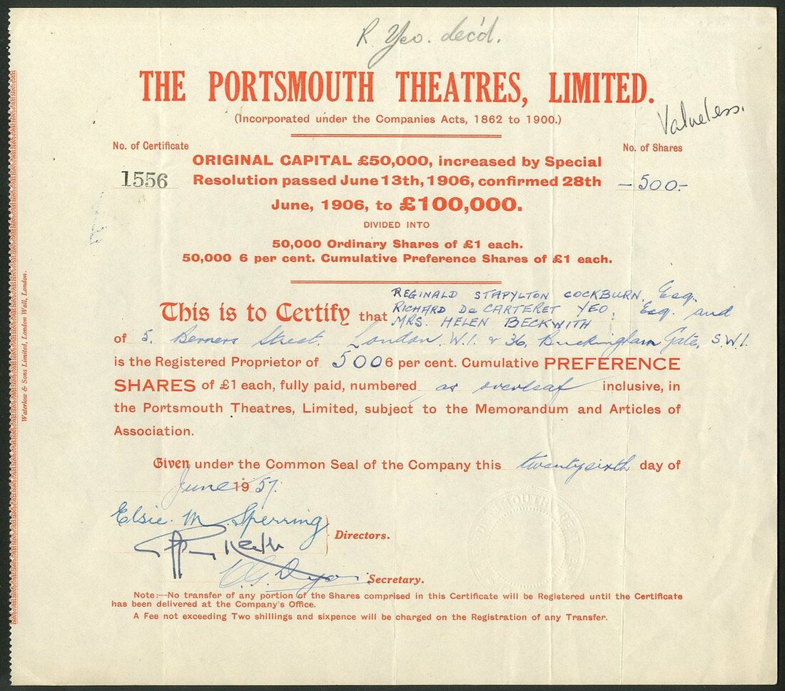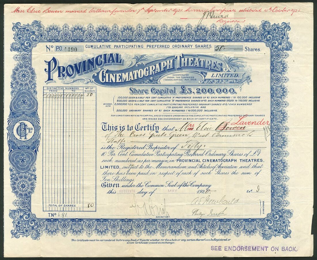 Great Britain: A collection of cinema and film companies, comprising Biograph Theatres Ltd., 19[08], #102; Southsea Picture Playhouse Co. Ltd., 19[20], #293; Dalry Victory Cinema Ltd., 19[28], #36; Cinema Combine Limited, 192[0], #7; Provincial Cinematograph Theatres Ltd., 192[0], #4490 with 4 page prospectus; Gaumont-British Picture Corporation Ltd., 19[48]; Portsmouth Theatres Ltd., 19[57], and, Kinemas Limited, 19[60]. Fine to Very Fine (9).