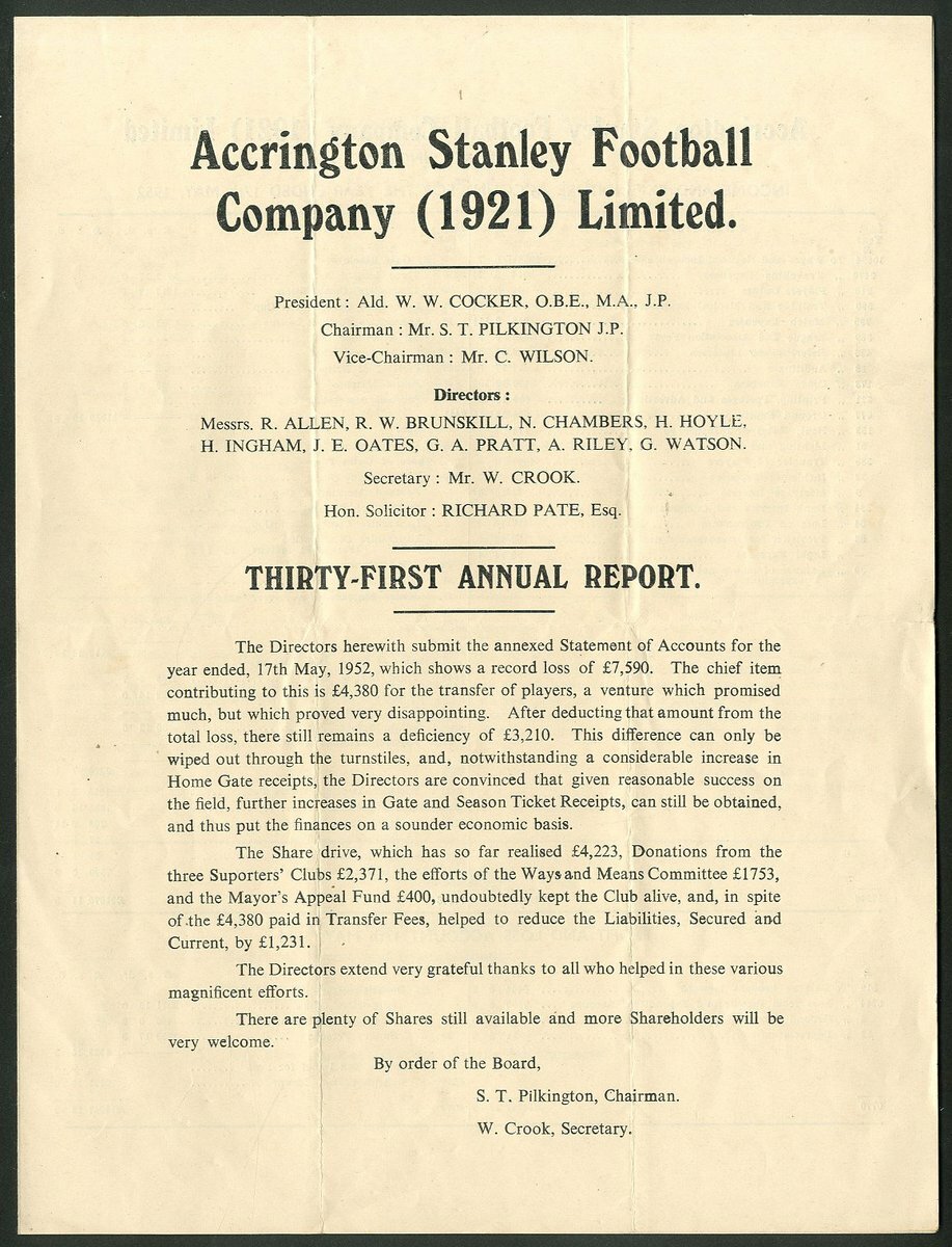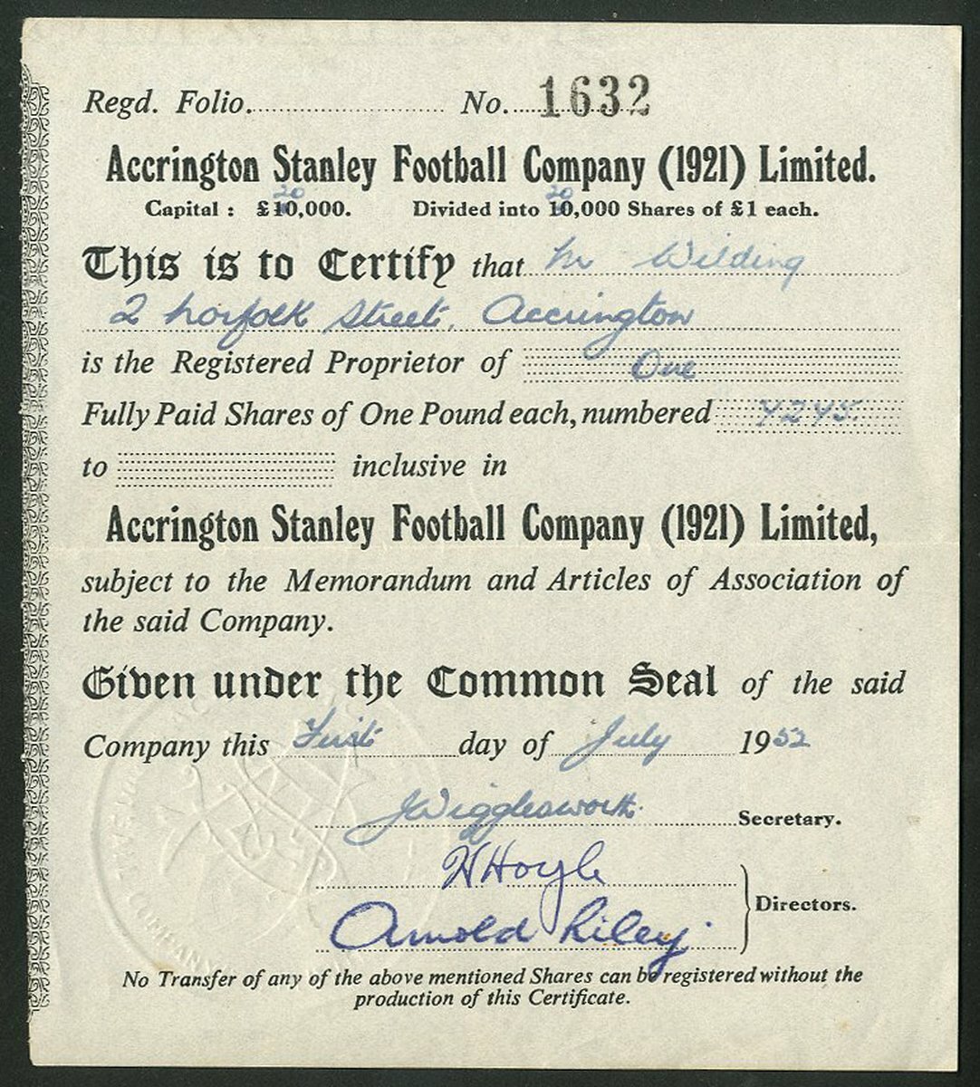 Great Britain: Accrington Stanley Football Company (1921) Limited, £1 shares, 19[52], #1632, small format, black. Together with Annual Report for 1952 and share appeal card, 1951. Originally formed in 1891 but only played in the league from 1921 after the formation of this company. The company failed in 1966 and the current company acquired its assets. VF and rare.