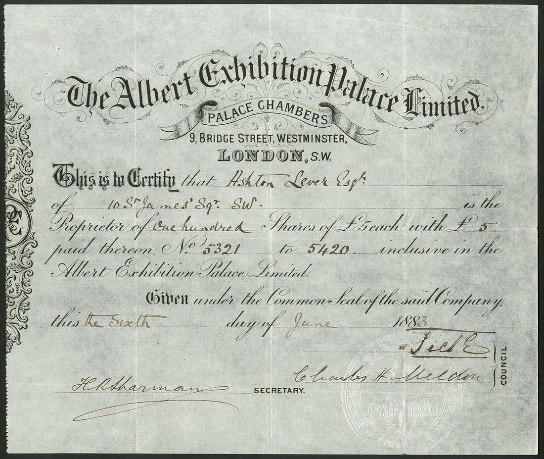 Great Britain: Albert Exhibition Palace Ltd., £5 shares, 188[3], #5321-5420, signed by the Duke of Teck as director, scrollwork left, black, embossed seal depicts the large exhibition hall and head of Prince Albert. Formed to re-erect the exhibition hall from the Dublin Exhibition, next to Battersea Park in London. Soon after the opening the company was reorganised as the Albert Palace Association and througout 1885 held many shows and concerts. Vistor numbers were not as expected and the Palace was closed in 1888. Efforts to save the building were made but eventually it was demolished and replaced by Albert Palace Mansions and Prince of Wales Mansions whilst Battersea Polytechnic and York Mansions were erected in the grounds. VF and rare.