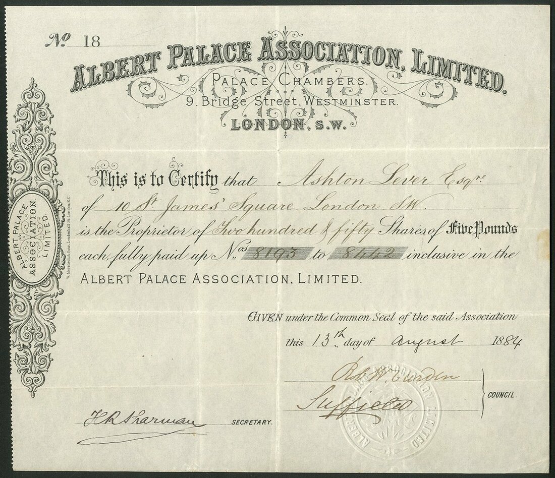 Great Britain: Albert Palace Association Ltd.,£5 shares, 18[84], #18, black printing. Reorganised from the original Albert Exhibition Palace Ltd. The venue held many shows and concerts but due to low visitor numbers the Palace was closed in 1888. Efforts to save the building were made but eventually it was demolished and replaced by Albert Palace Mansions and Prince of Wales Mansions whilst Battersea Polytechnic and York Mansions were erected in the grounds. VF and rare.