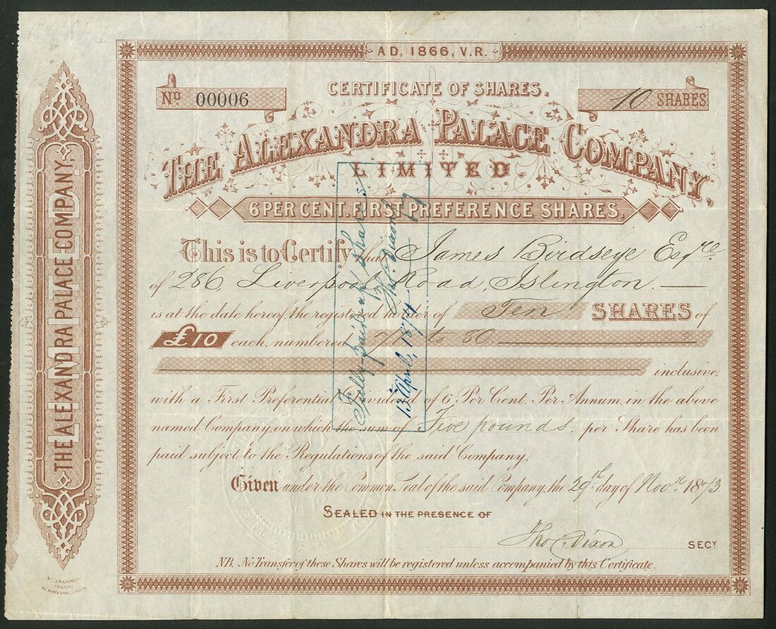 Great Britain: Alexandra Palace Co. Ltd., 6% first preference shares, 18(73), #00006, ornate border, brown, part paid but endorsed 'fully paid'. Opened in 1873 in North London, set within 196 acres of parkland. Just 16 days after it's opening the building was destroyed by fire but was rebuilt within 2 years. Following financial difficulties in 1900, the Alexandra Palace and Park Trust was formed to maintain and operate the buildings and parkland. The first BBC television broadcasts were made from there in 1936. Burnt down again in 1980 but rebuilt and now in constant use for corporate and private events. VF and rare.