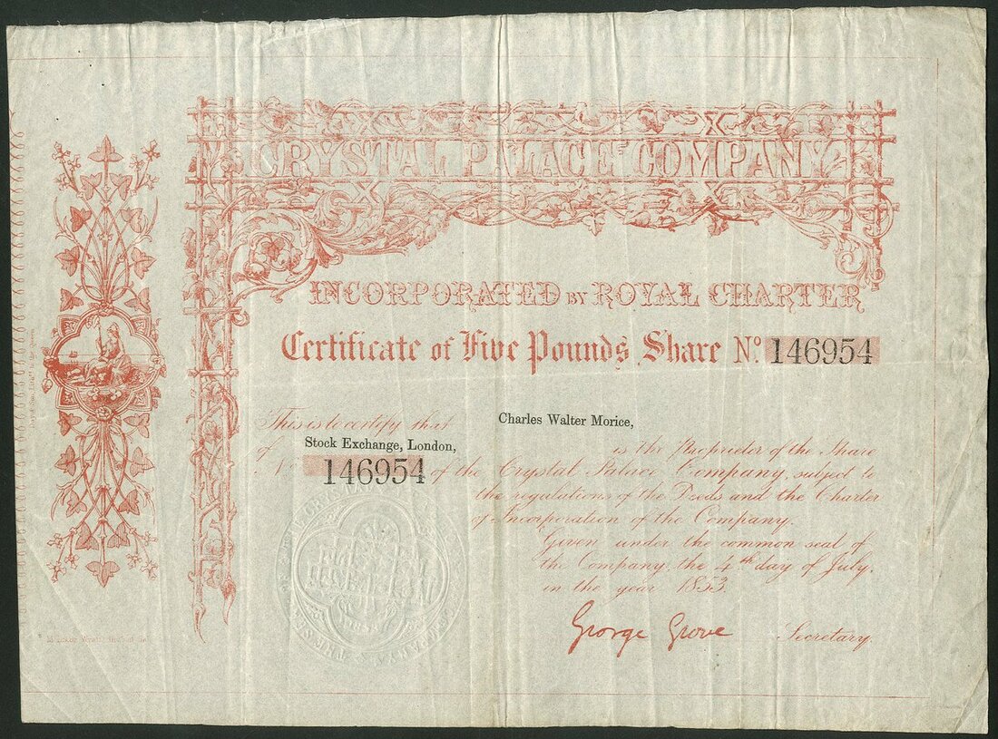 Great Britain: Crystal Palace Company, certificate of £5 share, 1853, #146954, ornate design with small vignette of Britannia, red. Built for the Great Exhibition of 1851 in Hyde Park to the designs of Joseph Paxton. Dismantled and moved to Sydenham where it stayed until it was destroyed by fire in 1936. Creasing, AVF.