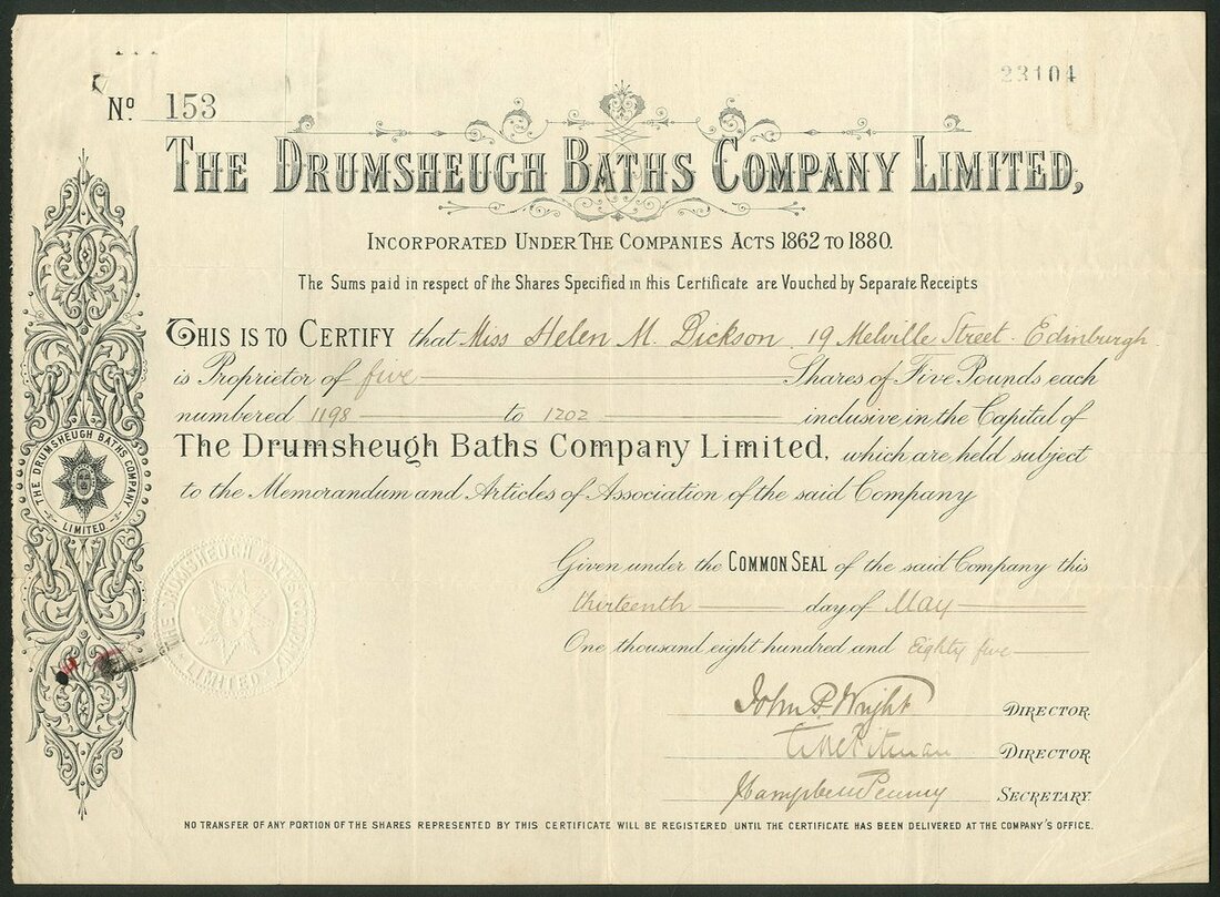 Great Britain: Drumsheugh Baths Company Limited, £5 shares, 18[85], #153, scrollwork at left, black. The Turkish and Swimming baths in Edinburgh was built in Moorish style in 1882. Sadly destroyed by fire in 1892 but rebuilt shortly afterwards. The company went into liquidation shortly afterwards and the building and assets were acquired by the present company Drumsheugh Baths Club Limted in 1902. VF and rare. First time at auction.