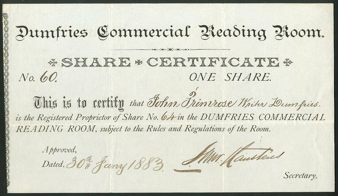 Great Britain: Dumfries Commercial Reading Room, one share, [1883], #60, black. An old institution formed by at least 1818. We can find no further information. VF and rare, first time at auction.