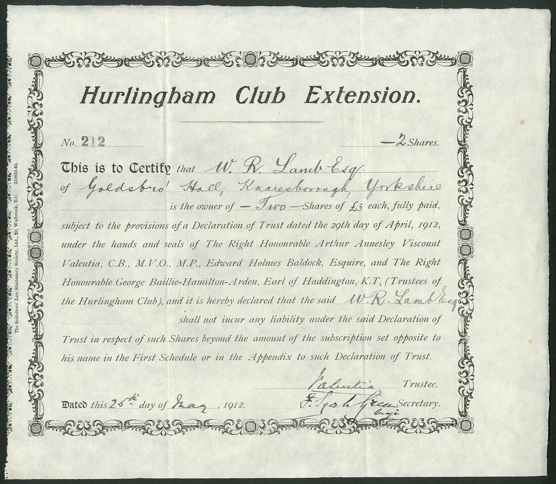 Great Britain: Hurlingham Club Extension, £5 shares, 1912, #212, signed by Viscount Valentia as trustee, ornate border, black. This Fulham, London club opened for pigeon shooting in 1867, although this sport ceased in 1905. The estate was purchased in 1874, the year Polo was first played there and the rules formalised in the following year. The Polo grounds were used for housing following WW2 but the name is still used by the Hurlingham Polo Association. Many sports are still played at the club but it is best known for it's pre Wimbledon Tennis Championships held every year. VF.