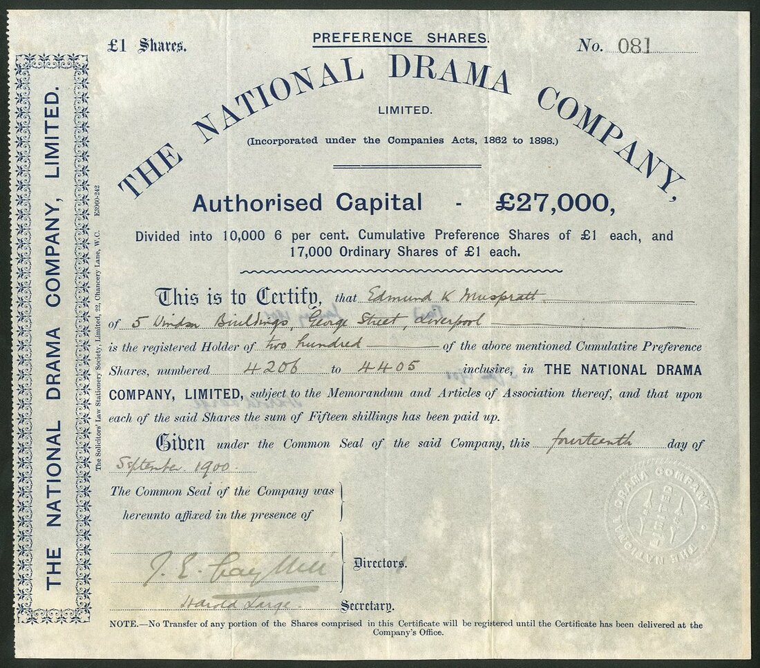 Great Britain: National Drama Company Ltd., £1 preference shares, [1900], #081, black. Formed in 1900 to acquire Sir Frank Benson's Theatrical Troupe which performed mostly Shakespeares plays and organised many annual Stratford-upon-Avon Shakespearian festivals at the Memorial Theatre. Although Benson had a long career this company failed after a short time. VF and rare.