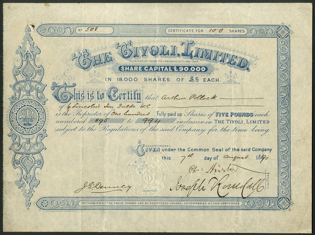 Great Britain: Tivoli Ltd., £5 shares, 188[90], #508, ornate border and scrollwork, blue. This Music Hall was built on the former site of the Tivoli Beer Garden & Restaurant in the Strand, London. It opened in 1890 and became a leading venue in London. Closed in 1914 due to a proposed road widening scheme, it was demolished in 1916. Spike hole, AVF and scarce.