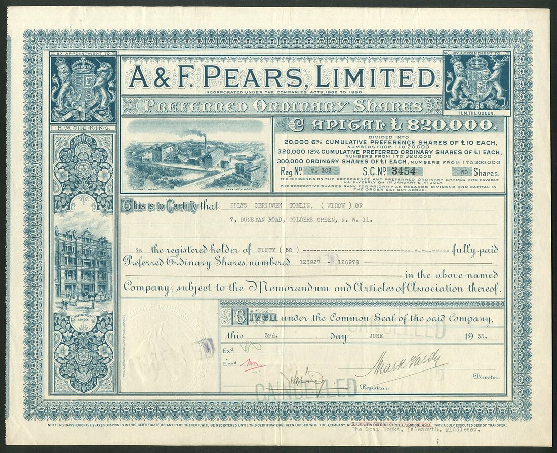 Great Britain: A & F. Pears Limited, certificate for preferred ordinary shares, 19[35], #3454, an attractive design printed by Waterlow & Sons with vignette of the company's Orchard Works and Lanadron Works, their retail premises in Oxford Street, London, the coats of arms of the King and Queen, blue, stamped cancelled. The company has it's origins in the early 19th century, producing it's now famous soap. Probably most famous for the use of the painting 'Bubbles' by Millais in it's extensive advertising campaign of the 1890's. Acquired by Unilever. GVF.