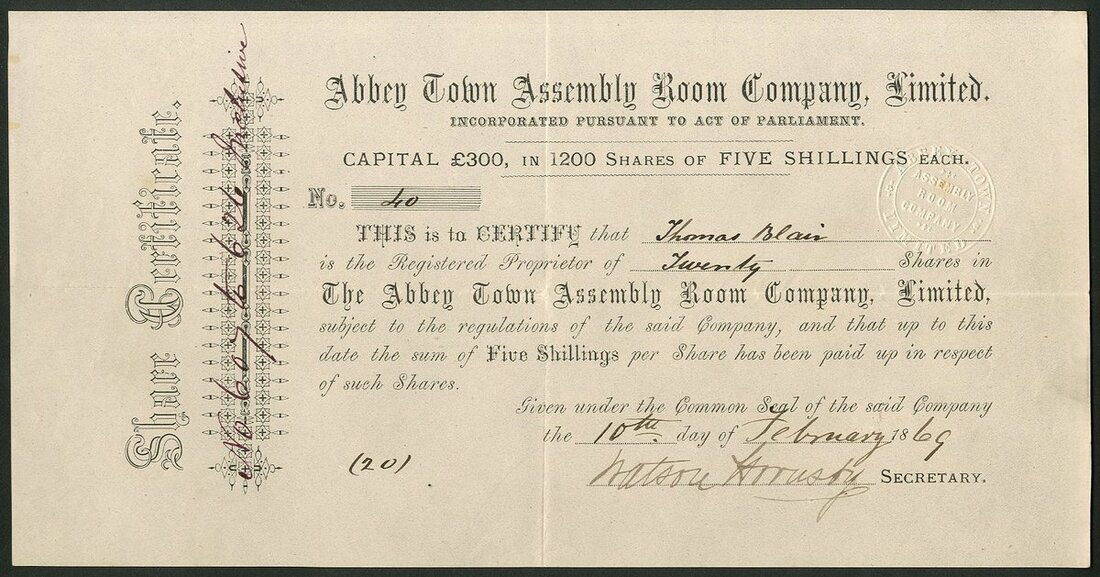 Great Britain: Abbey Town Assembly Room Co. Ltd., 5 shilling shares, 18[69], #40, black printing. Cumberland. GVF.