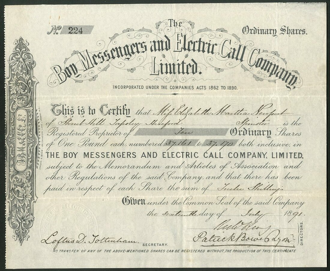 Great Britain: Boy Messengers and Electric Call Company Ltd., £1 ordinary shares, 18[91], #224, signed as director by the Hon. Patrick Bowes-Lyon, son of the 13th Earl of Strathmore, uncle of Elizabeth the Queen Mother. Also won the mens doubles Wimbledon championship in 1887 and runner up in 1888. Together with typed letter on printed company letterhead. VF and rare.