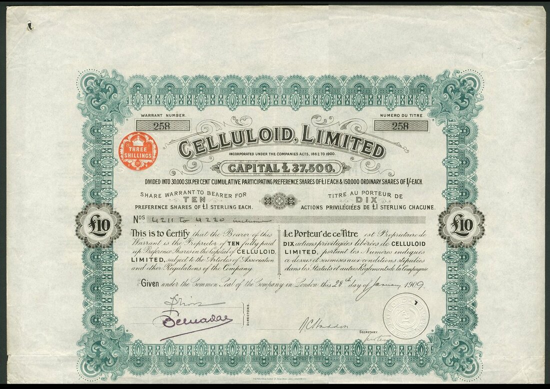 Great Britain: Celluloid Limited, a bearer warrant for 10 preference shares of £1, 190[9], #258, large format piece printed in English and French, ornate border, green and black, with coupons. We presume the company was mostly involved with the film/cinema industry as its meetings were held at the offices of the Société Francaise de Photographie in Paris. EF.
