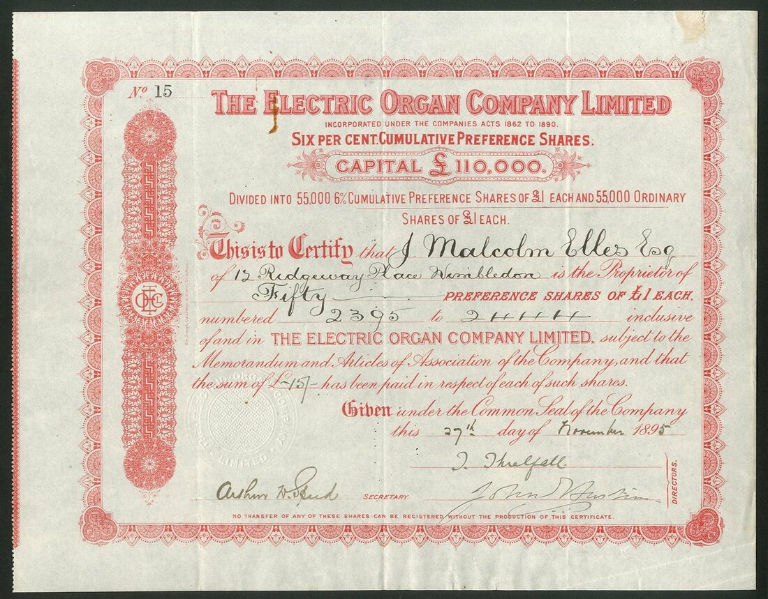 Great Britain: Electric Organ Company Ltd., 6% cumulative preference shares of £1, 189[5], #15, signed by Thomas Threlfall as director. Decorative red printing. Formed to acquire the Hope Jones Electric Organ Co. Ltd. and it's patents to build its own organs as the previous licenced builders proved unsatisfactory. Hope-Jones was considered the inventor of the theatre organ. The company had failed by 1899 as Hope-Jones fled to the USA following being found with a boy in his Hereford factory! Thomas Threlfall was the Chairman of the Royal Academy of Music. Repair to top right corner, AVF.