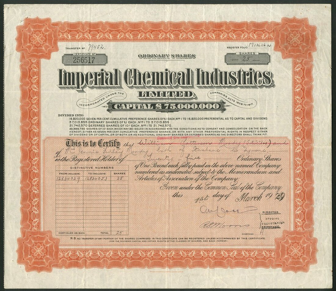 Great Britain: Imperial Chemical Indistries Ltd., ordinary shares, 19[29], #256517, ornate border, red and black. Formed in 1926 by the merger of Brunner Mond, Nobel explosives, United Alkali and British Dyestuffs Corporation to become the largest manufacturer in Great Britain. ICI was to become a household name. AVF and rare early date.