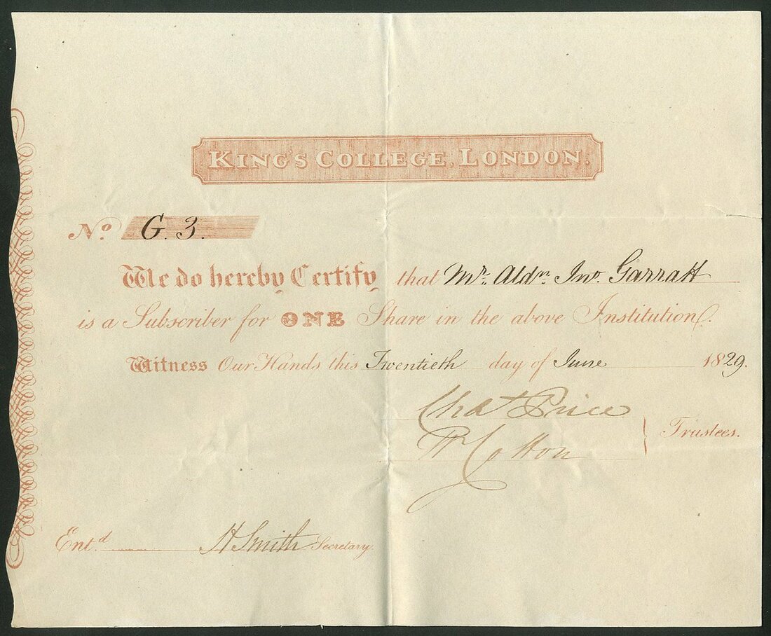 Great Britain: King's College, London, one share, 18[29], #G3, simple orange-brown printing. Formed by Royal Charter in 1829 under the patronage of the Duke of Wellington and George IV. Incorporated into the University of London when it was founded in 1836. Couple of small edge tears but VF and rare.