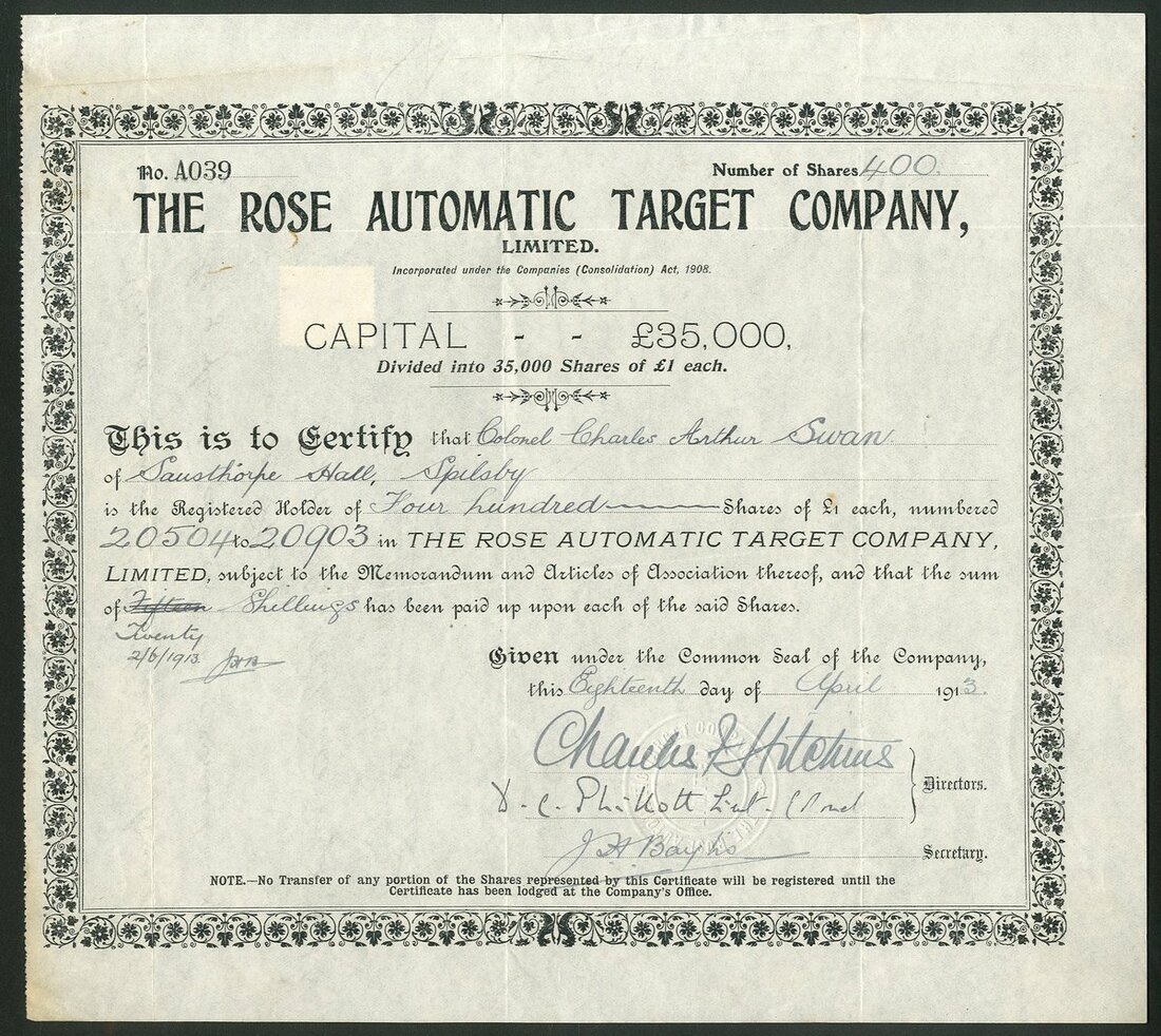 Great Britain: Rose Automatic Target Co. Ltd., £1 shares, 191[3], #A039, ornate border, black. Patented an improved electric gun target recording device which was trialled at Bisley in 1912. VF.