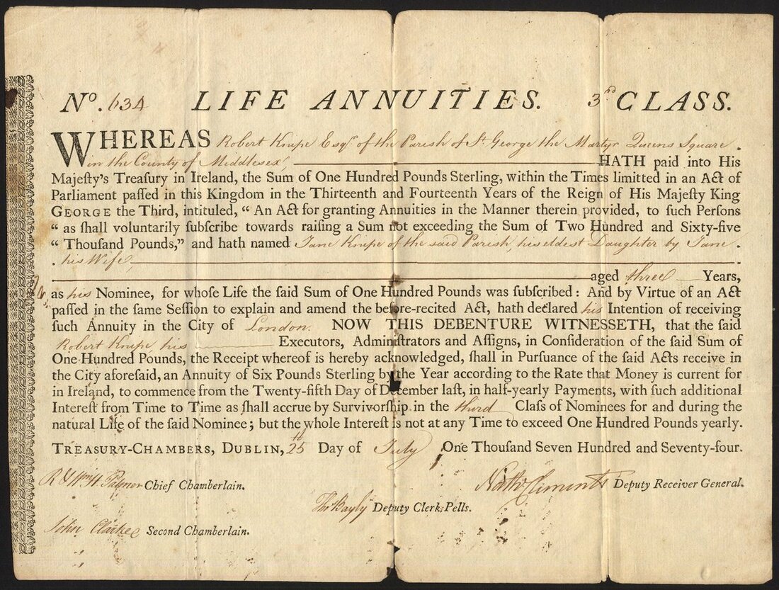 Ireland: Irish Government Life Annuities, a 6% debenture certificate for £100, [3rd] Class, Dublin 1774, #634, black printing with manuscript insertions of the holder and, in this case, his eldest daughter, aged 3. Three folds with minor separation, F-VF and rare.