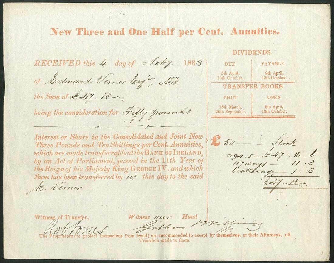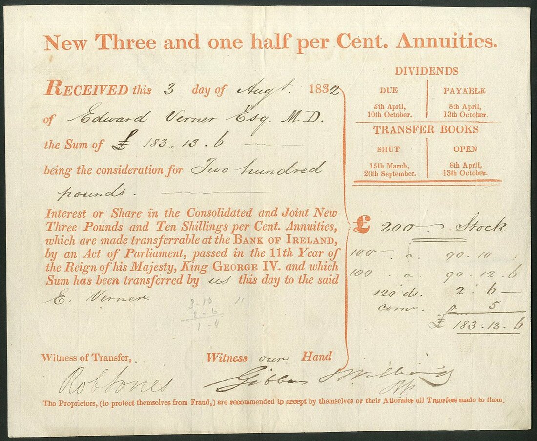 Ireland: New Three and one half per Cent. Annuities, a group of inscribed stock certificates, 183[2], 183[3] and 183[8], all different printings in red. Minor trimming but all rare and VF (3).