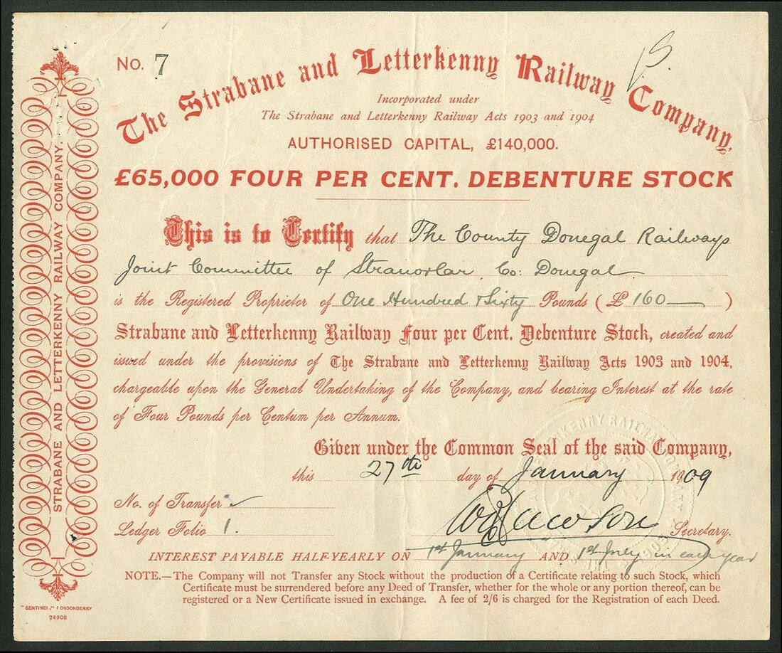 Ireland : Strabane and Letterkenny Railway Company, 4% Debenture stock, £[160], 19[09], #7, red. A narrow gauge railway (3 feet) opened in 1909 and the last to be built in Ireland (except for slightly smaller gauges in amusement parks). It ran the 19.25 miles between the two towns and operated until 1960. VF and rare.