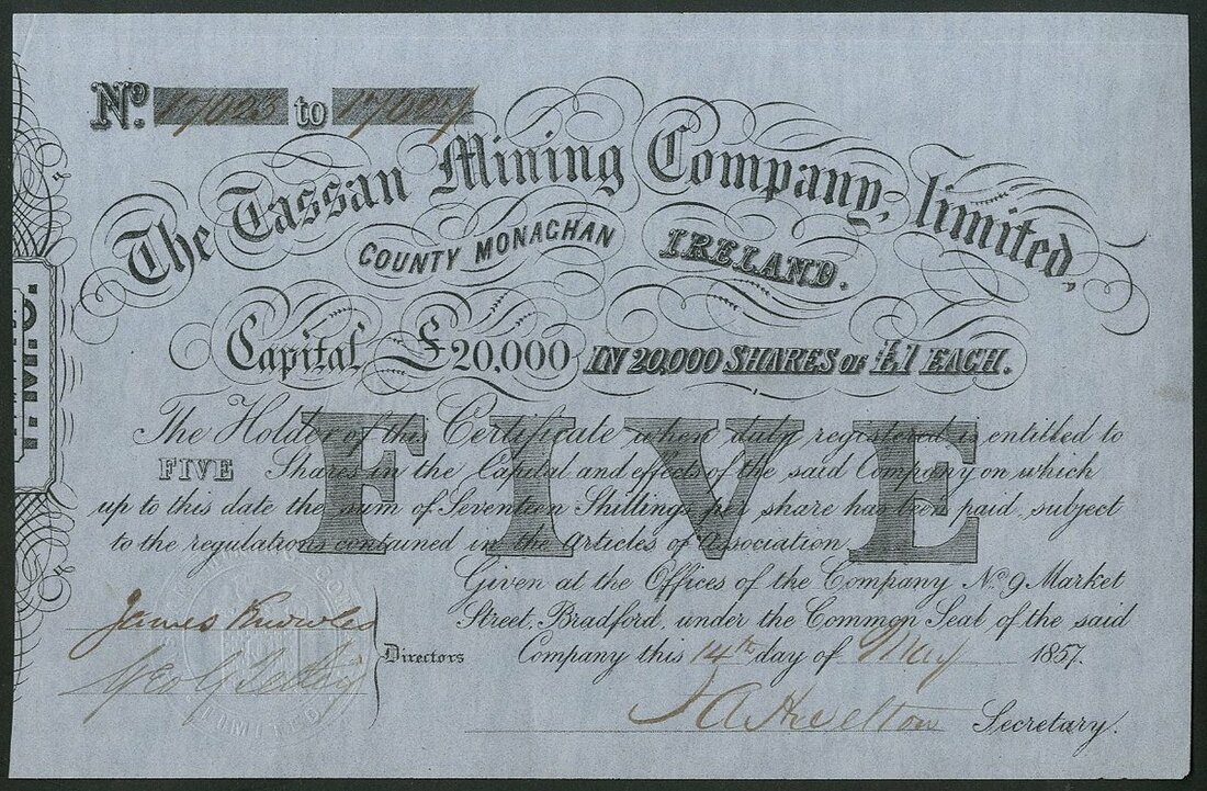 Ireland: Tassan Mining Co. Ltd., 5 shares of £1 each, 1857, #17023-17027, black printing on pale blue paper. Lead mine in County Monachan. EF.