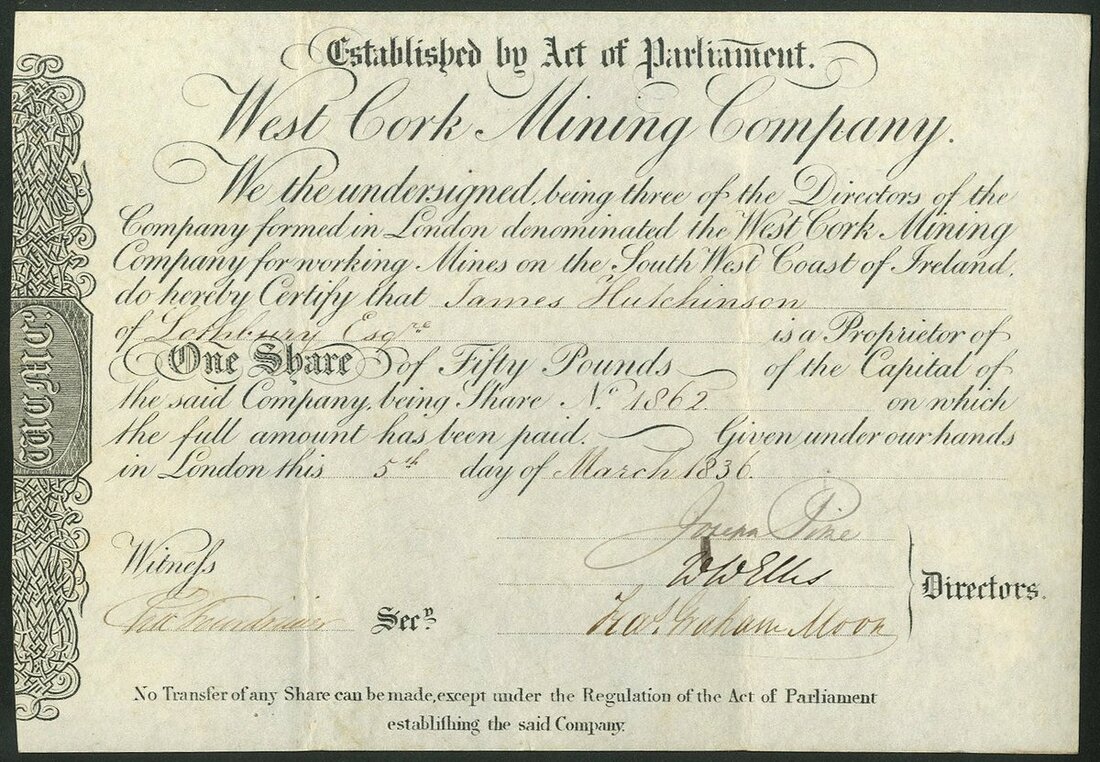 Ireland: West Cork Mining Co., one share of £50, London [1836], black printing, on vellum. Formed to work copper mines on the Islands of South West Ireland. Horse Island was extensively worked by this company and many remains of shafts remain to be explored - or fallen into! The ore was shipped to Swansea to be smelted and sold. GVF.