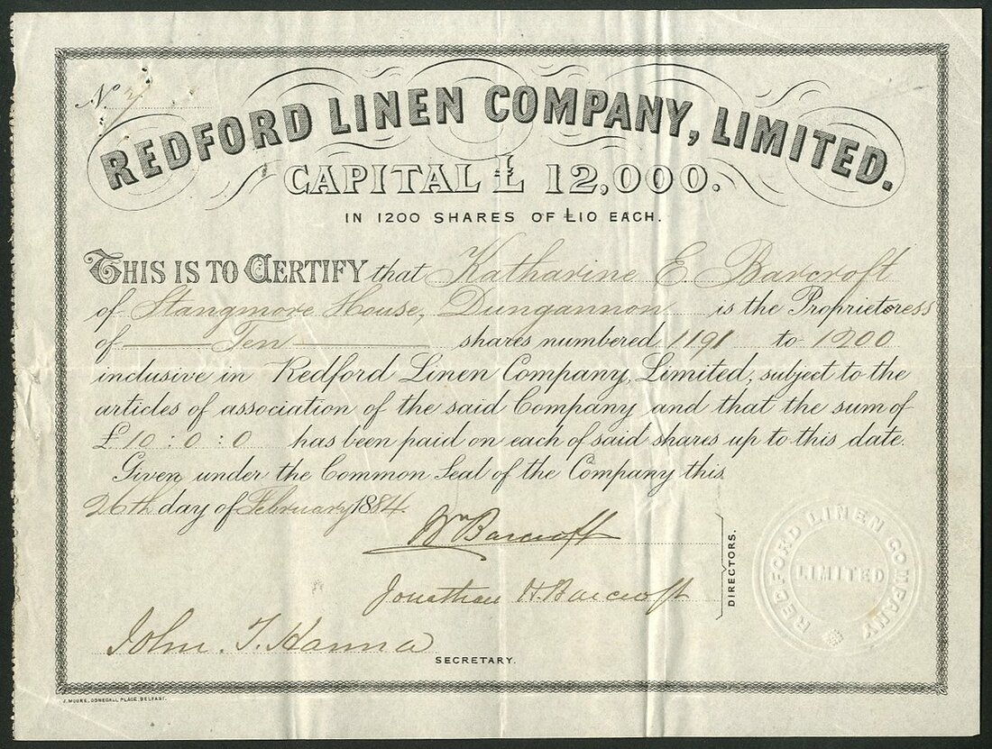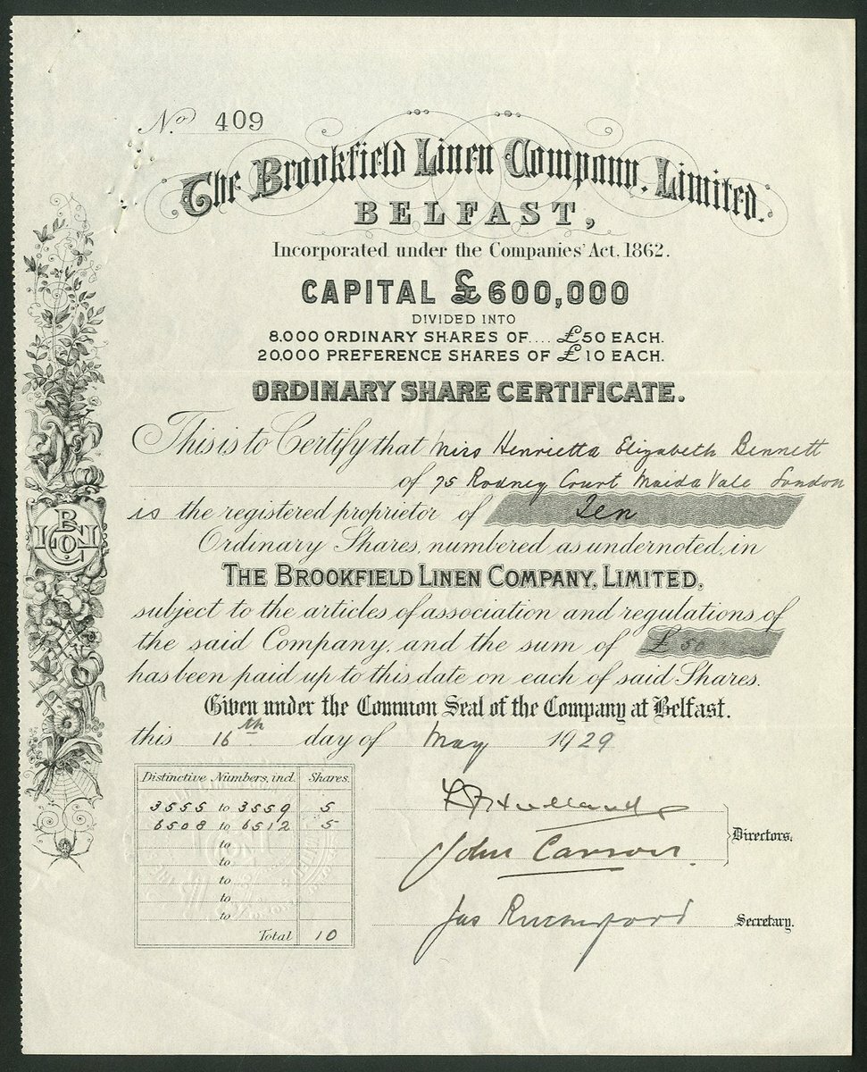 Ireland: Pair of Belfast linen companies, Redford Linen Co. Ltd., £10 shares, 18[84], #7, small format, black, and Brookfield Linen Co. Ltd., £50 ordinary shares, 19[29], #409, also black. VF and both rare.(2)
