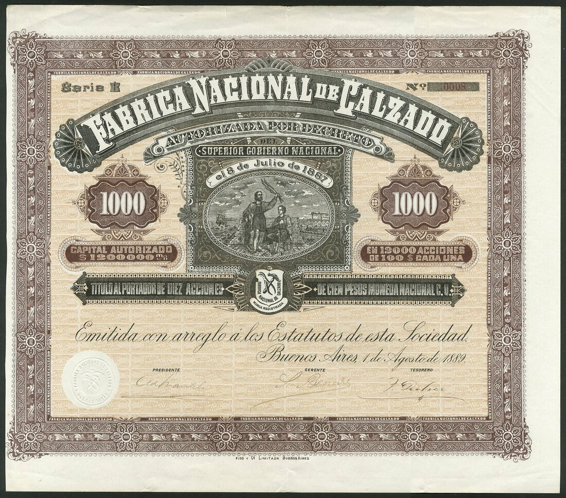 Argentina: Fabrica Nacional de Calzado, certificate for ten shares of 100 pesos, Buenos Aires 1889, series B, no.0008, ornate border and central vignette depicting two shoe factory workers, brown and black on gold underprint. Tiny nicks at top edge, GVF and scarce.