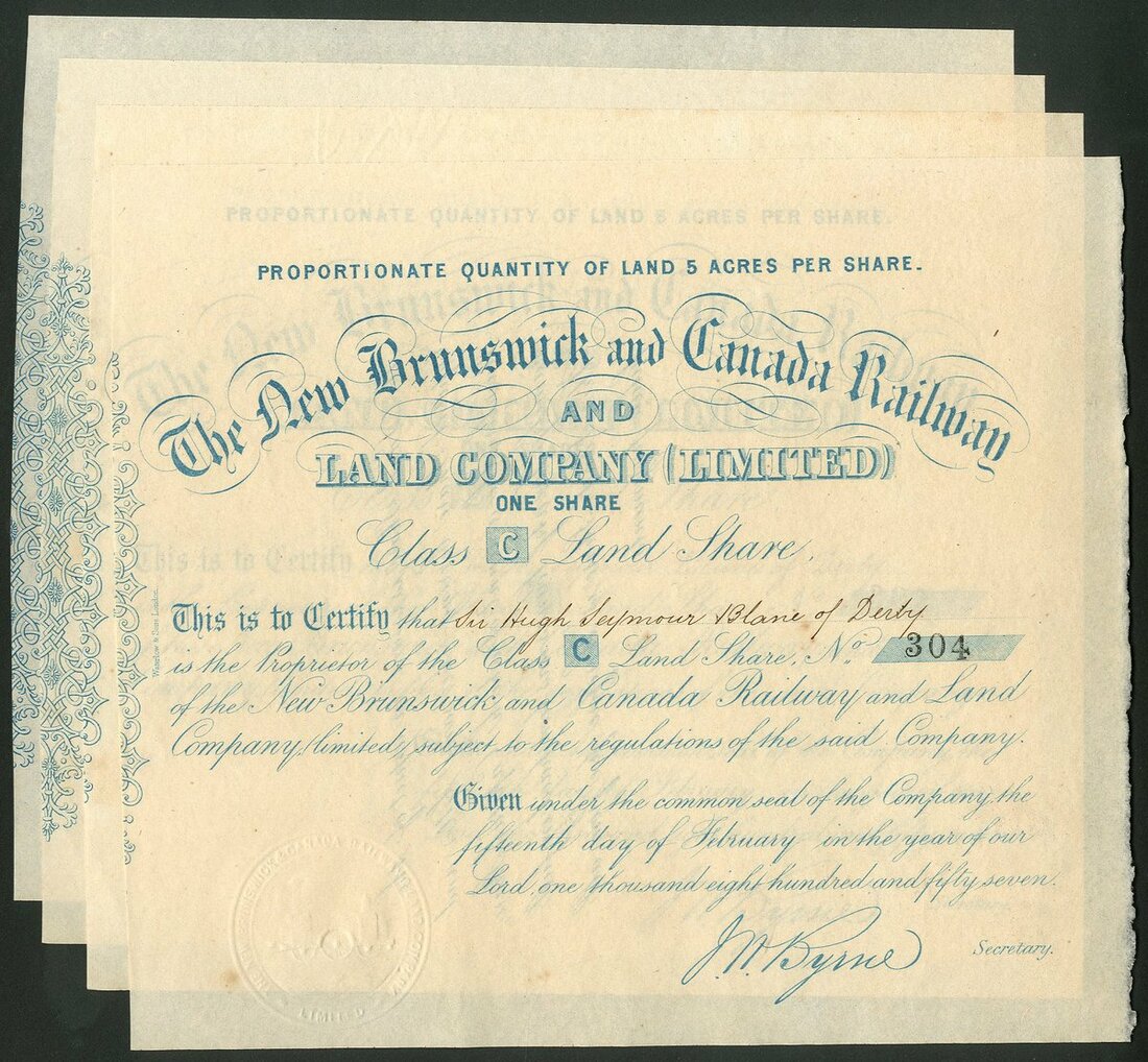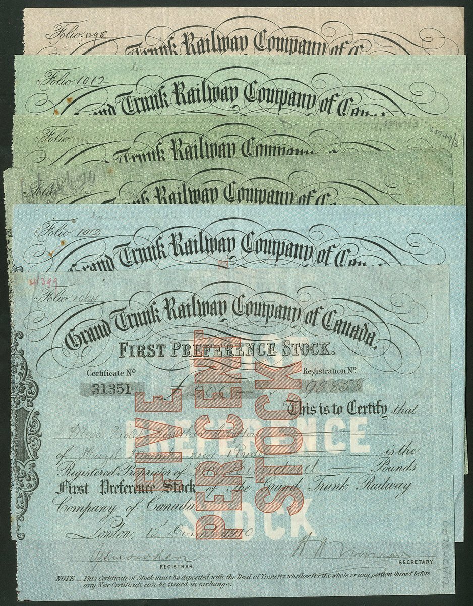 Canada: Grand Trunk Railway Company of Canada, a series of certificates comprising, First Preference stock, 19[10] and 19[18]; Second Preference stock, 190[11], 191[6] and 191[7]; Third Preference stock, 191[4], together with New Brunswick and Canada Railway and Land Company Limited, Class C Land share, 1857, 4 examples. The last EF, the remainder VF (10).