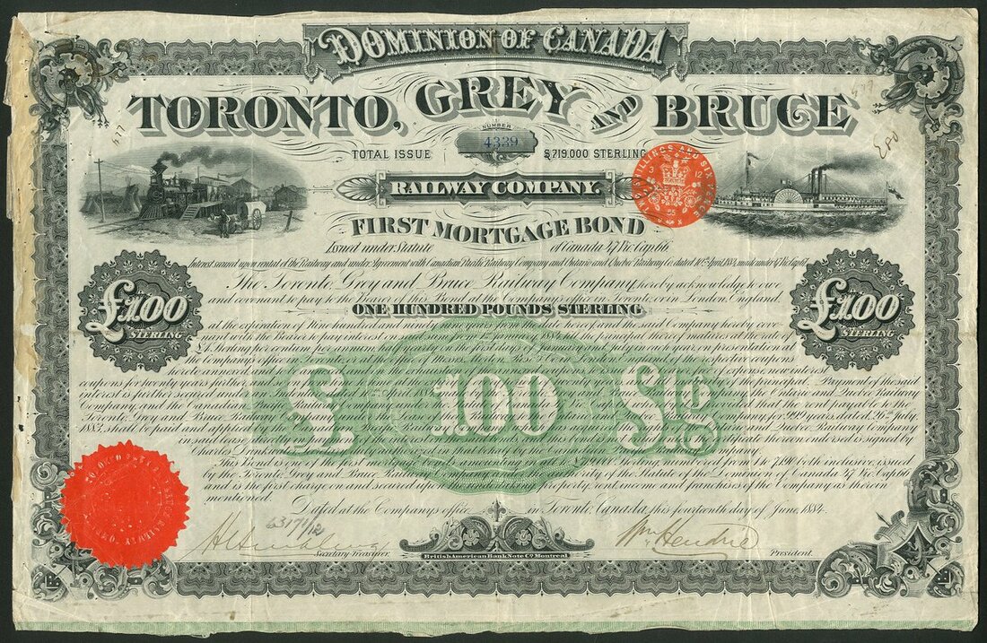 Canada: Toronto, Grey and Bruce Railway Company, first mortgage bond for £100, Toronto 1884, #4339, ornate border, small vignettes at top depicting steam train at station to right and steamboat to right, black with green underprint, with coupons. An interesting piece that was initially issued for 999 years! In the early years of this hobby we used to buy these bonds on the London Stock Exchange at around £50-60 as they were still paying a 4% dividend! In recent years the bonds have been repaid by Canadian Pacific Railway who own the line. VF.