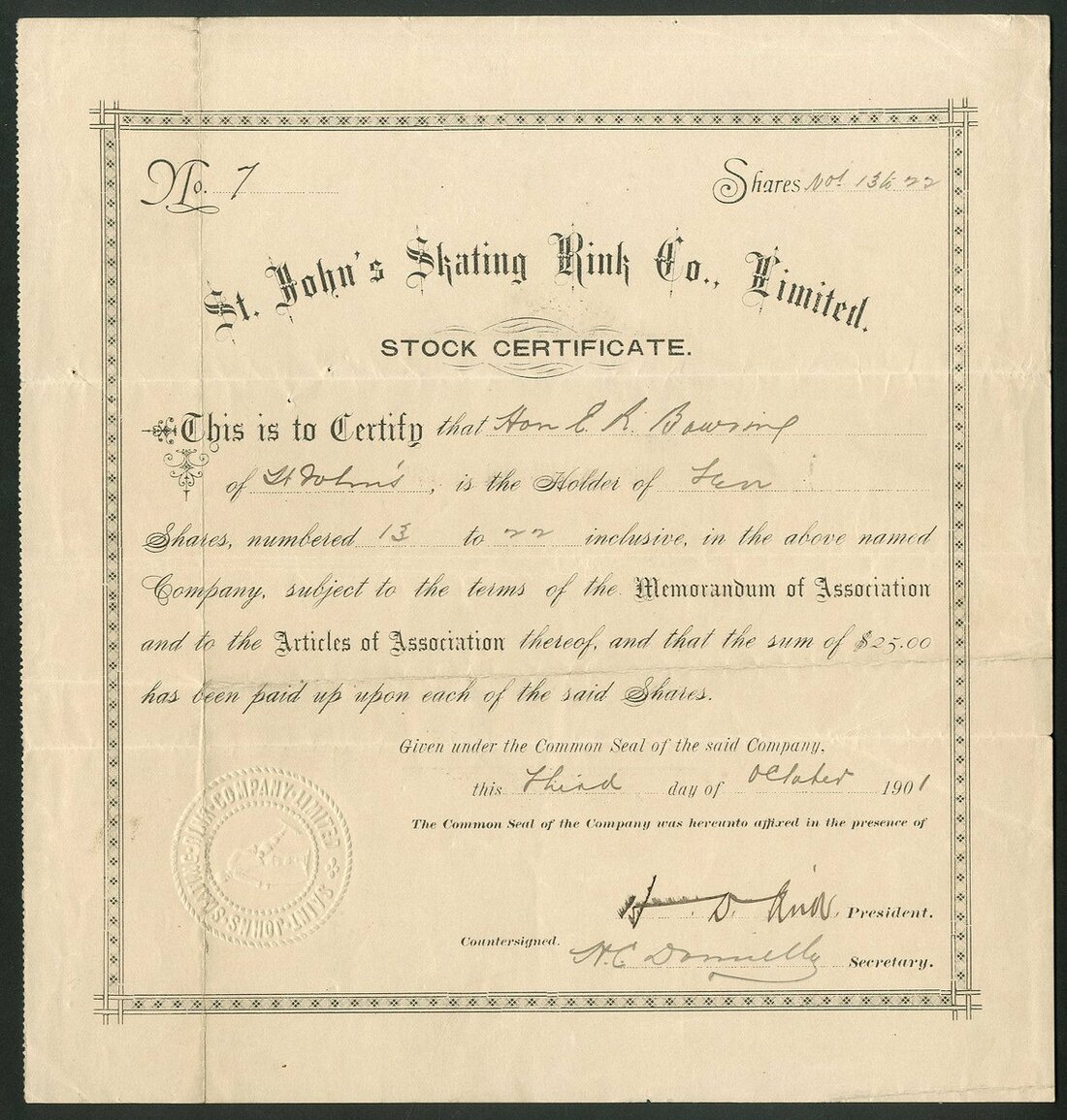 Canada: Newfoundland. St. John's Skating Rink Co. Ltd., $25 shares, 190[1], #7, decorative border, black. Building started in 1898 at the old Railway Terminus and was opened in 1899 and named Prince of Wales Rink. Put up for sale in 1933 and sold to the Arena Rink Company. Burnt down in 1941. The venue hosted many hockey league championships. AVF.