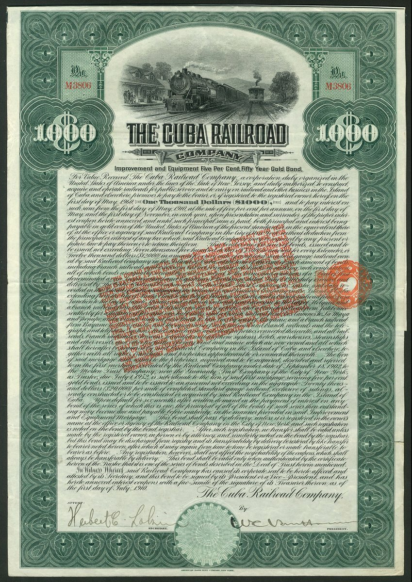 Cuba: Cuba Railroad Company, Improvement and Equipment 5% 50 year Gold Bond for $1000, 1910, #M3806, signed by W.C. van Horne as President, attractive vignette of steam trains passing station at top, green and black, printed by the American Bank Note Co., with coupons. Not cancelled. GVF.