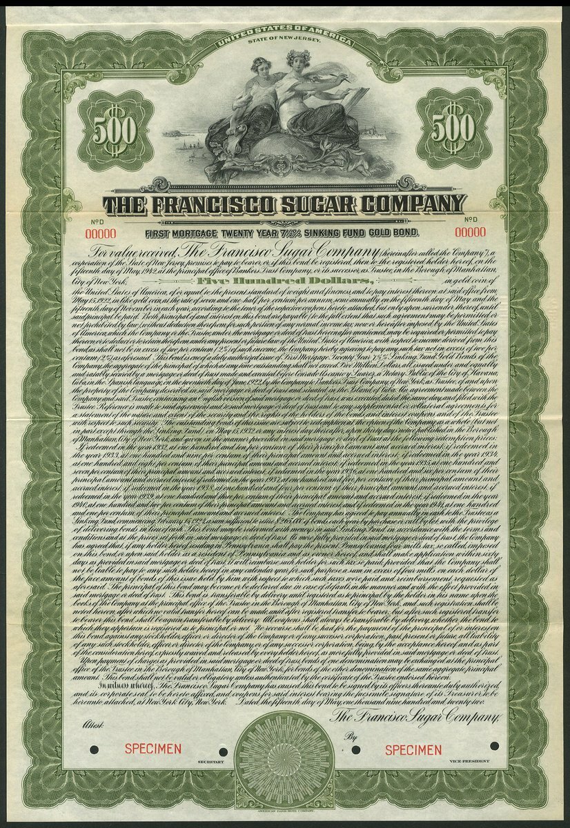 Cuba: Francisco Sugar Company, First Mortgage 20-Year 7½% Sinking Fund Gold Bond, 1922, a specimen bond for $1000, from the ABNCo. archives, allegorical figures at top, green and black, with coupons, overprinted SPECIMEN. Incorporated in New Jersey in 1899, a pioneer venture in Eastern Cuba. The company lost heavily in the Cuban Nationalisation of US companies in 1960. VF-EF.