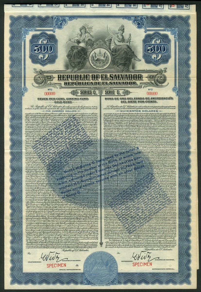 El Salvador: Republic of El Salvador, 7% Sinking Fund Gold Loan, a specimen bond for $500, 1923, series C, from the ABNCo. archive, allegorical figures with seal at top, ornate border, blue and black, with coupons. VF.