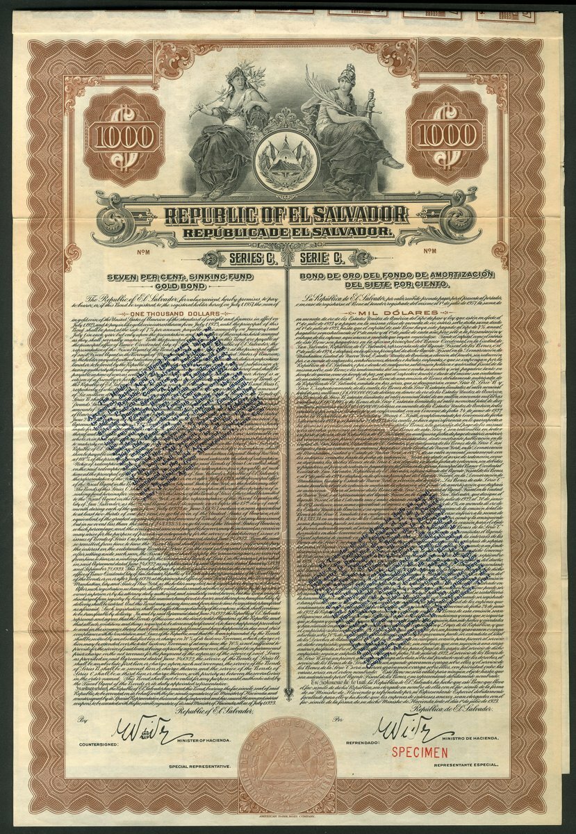 El Salvador: Republic of El Salvador, 7% Sinking Fund Gold Loan, a specimen bond for $1000, 1923, series C, from the ABNCo. archive, allegorical figures with seal at top, ornate border, brown and black, with coupons. VF.