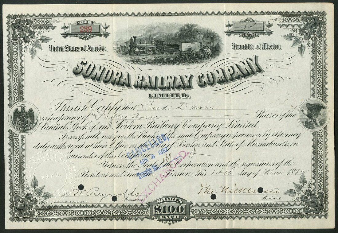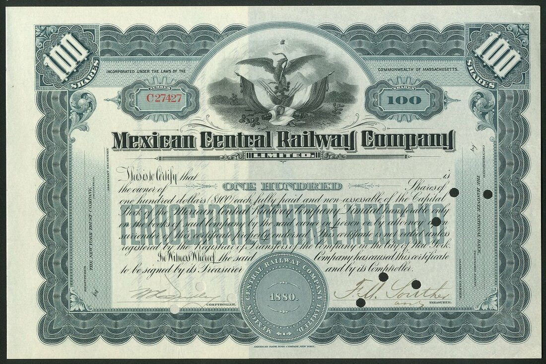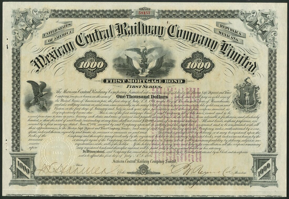 (x) Mexico: Mexican Central Railway Co. Ltd., $1000 7% first mortgage bond, first series, 1881, #58157, Mexican eagle at top, ornate border, black, with coupons detached. Together with Sonora Railway Co. Ltd., Mexico, $100 shares, 18[82], #289, train passing pedestrians at top, ornate border, black, cancelled, and Mexican Central Railway Co. Ltd., 100 shares, #C27427, unissued but signed by Comptroller and Treasurer, hole cancels, Mexican eagle at top, blue/grey. VF, EF (2) and AEF but staple holes to left edge, light discolouration (3).