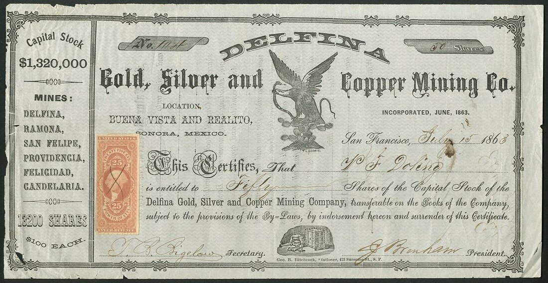 Mexico: Delfina Gold, Silver and Copper Mining Co., $100 shares, 186[3], #104, eagle in centre, decorative border, black, revenue stamp. Mines at Buena Vista and Realito, Sonora. Small tears on corners, thin paper, AVF.