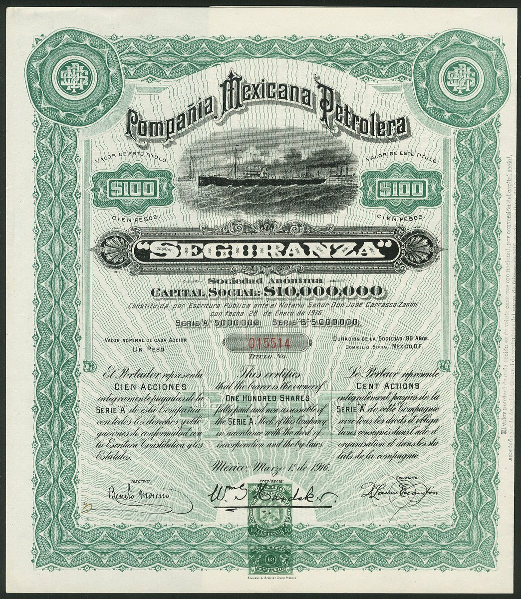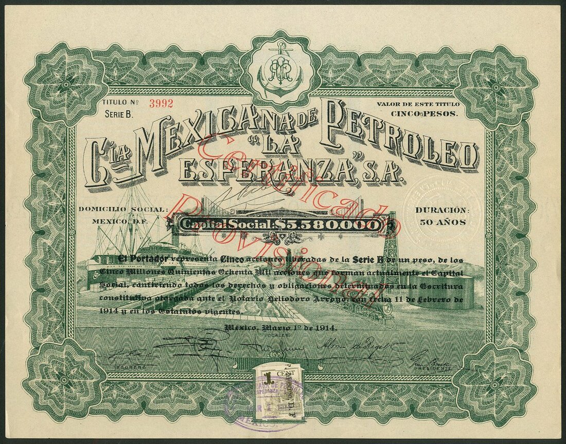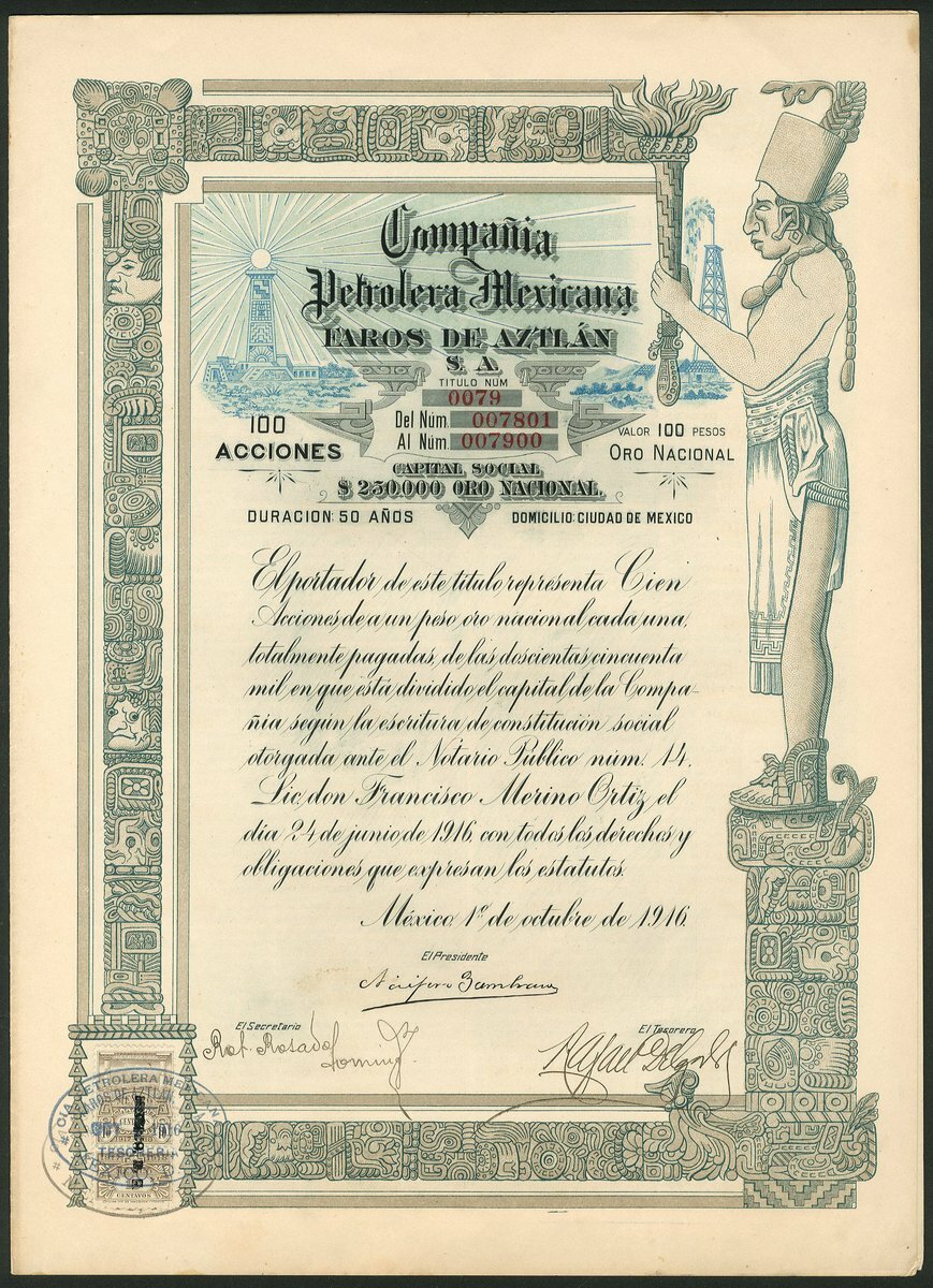 (x) Mexico: A group of 6 oil & mining companies, comprising Compañia Mexicana Petrolera "Seguranza", 100 peso share, Mexico 1916, #15514, oil tanker at sea, green and black, with coupons; Cia Mexicana de Petroleo "La Esperanza", 50 peso share, 1914, #3992, underprint of dockside with derrick, storage tank and shipping, green and black; Compañia Petrolera Mexicana Faros de Aztlán, 100 shares, 1916, #0079, large figure of Aztec on plinth, black and pale blue; Compañia Minera La Paz, Mexico 1910, #716, steam train and mine entrance; Negociacion Minera Santiago Apostol, Mexico 1919, #318, mine buildings and entrance,and, Compañia de Explotacion y Fraccionamiento de Tupátaro, Mexico 1909, #4094, allegorical female, all with coupons. VF-EF (6).