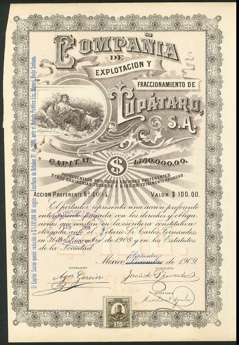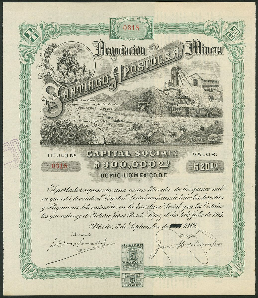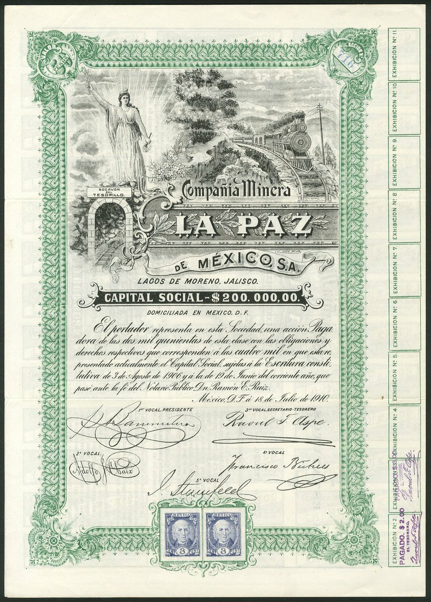 (x) Mexico: A group of 6 oil & mining companies, comprising Compañia Mexicana Petrolera "Seguranza", 100 peso share, Mexico 1916, #15514, oil tanker at sea, green and black, with coupons; Cia Mexicana de Petroleo "La Esperanza", 50 peso share, 1914, #3992, underprint of dockside with derrick, storage tank and shipping, green and black; Compañia Petrolera Mexicana Faros de Aztlán, 100 shares, 1916, #0079, large figure of Aztec on plinth, black and pale blue; Compañia Minera La Paz, Mexico 1910, #716, steam train and mine entrance; Negociacion Minera Santiago Apostol, Mexico 1919, #318, mine buildings and entrance,and, Compañia de Explotacion y Fraccionamiento de Tupátaro, Mexico 1909, #4094, allegorical female, all with coupons. VF-EF (6).