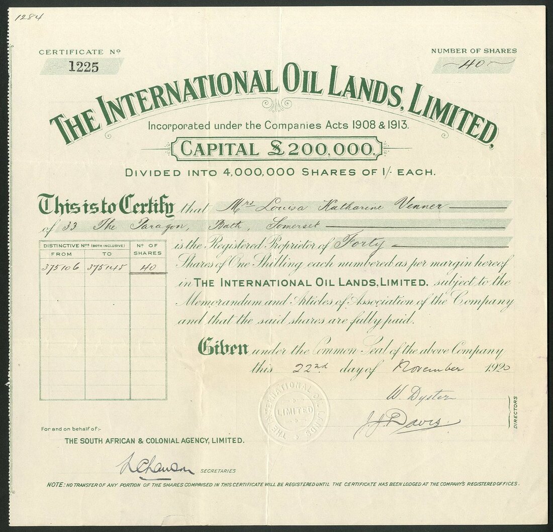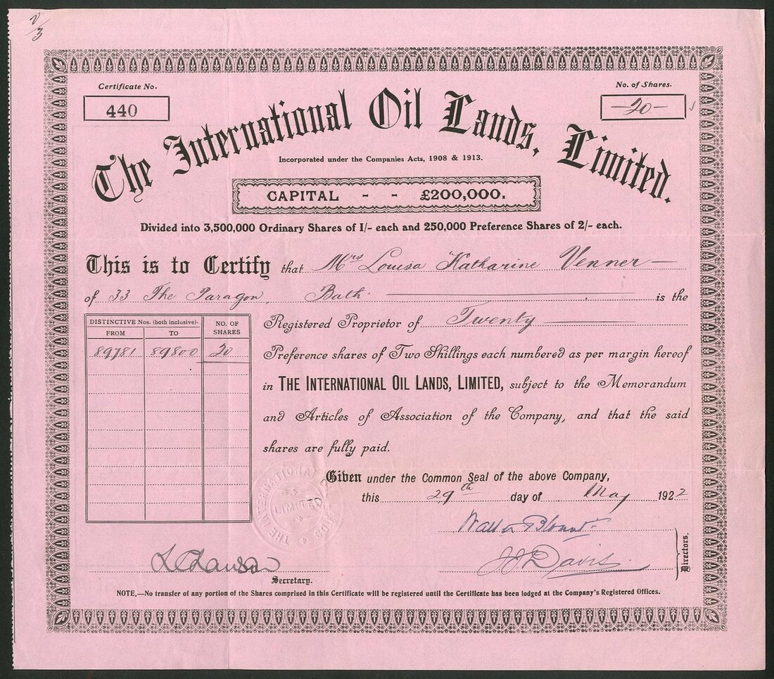 Trinidad: International Oil Lands Ltd., pair of certificates, 1 shilling shares, 192[0], #1225, green, and 2 shilling preference shares, 192[2], #440, black on pink. Owned properties in Trinidad, Egypt and Canada. Also owned the majority of shares in Oil exploration of Trinidad Ltd. Wound up in 1924. Both VF but the first with small tear at bottom. (2)