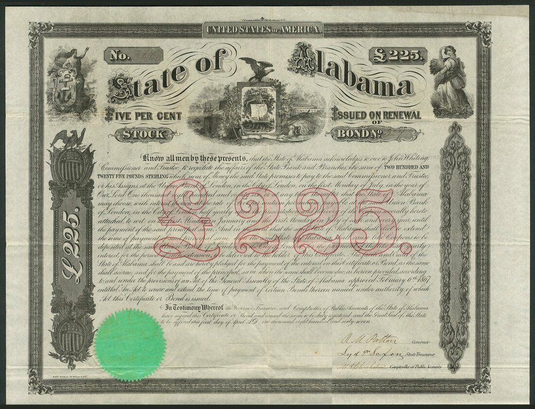 U.S.A.: State of Alabama, 5% Stock, bond for £225, payable in London, 1867, #360, signed by the Governor Robert M. Patton who served from December 1865 until July 1868, large format, black, red underprint, green seal, with coupons. GVF and rare.