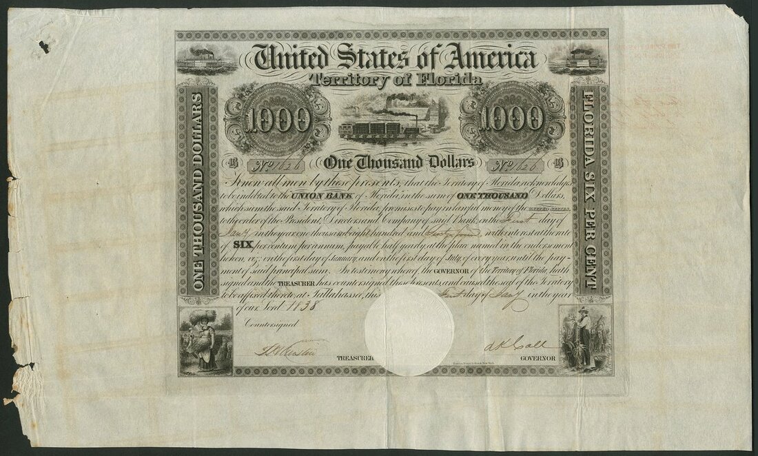 U.S.A.: Territory of Florida, 6% Loan, 1838, $1000 bond, #B1626, lovely piece with several vignettes including early steam train, woman gathering wheat and farmer picking crops, black, signed by R.K. Call as Governor, together with separate dividend warrants for getting interest paid in London. Tri-folded, VF but ragged left edge.