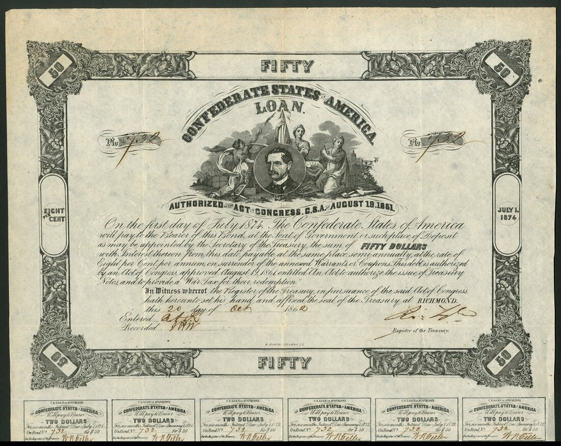 Confederate States: Act of August 19th 1861, $50, redeemable 1st July 1874, #732, Burton Harrison at top (Ball 83 - 998 issued), black, with coupons. VF.