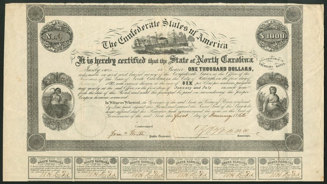 Confederate States of America: State of North Carolina, 6% Loan, 18[62], redeemable in 1892, $1000, #87, signed by Zebulon Baird Vance as Governor, blockade runner at top centre, black (Criswell 62S). AVF and scarce.