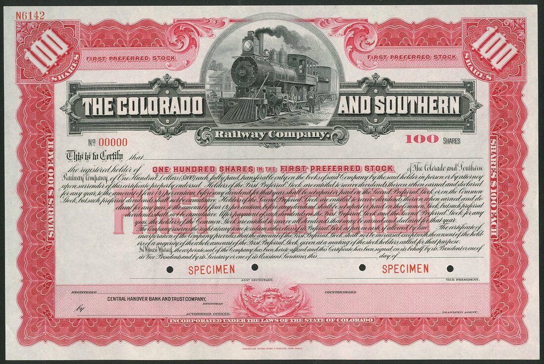 (x) U.S.A.: Colorado and Southern Railway Company, a specimen certificate for 100 shares of first preferred stock, circa 1900, from the American Bank Note Company archives, steam train centre, red and black, overprinted SPECIMEN, numbered 0000. EF and rare.