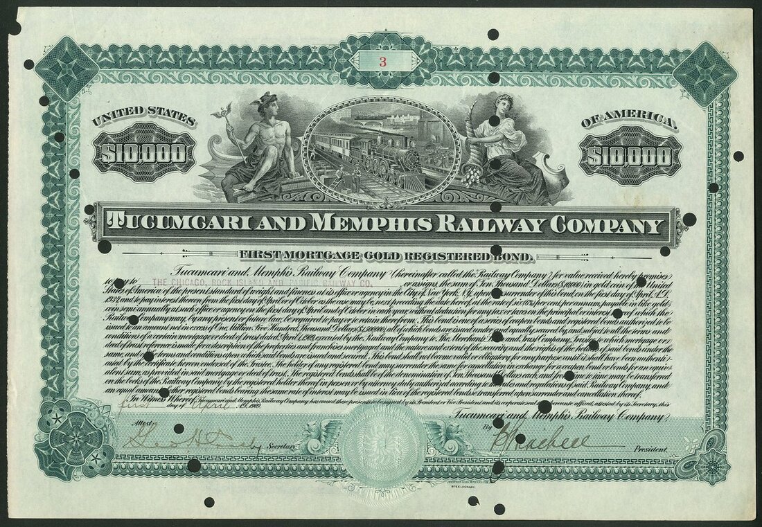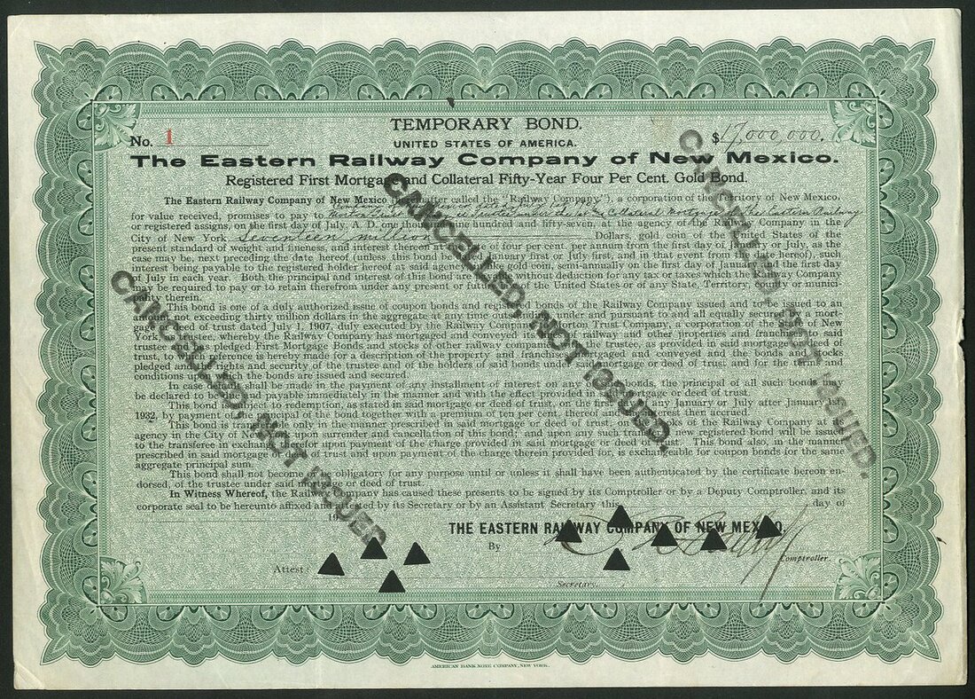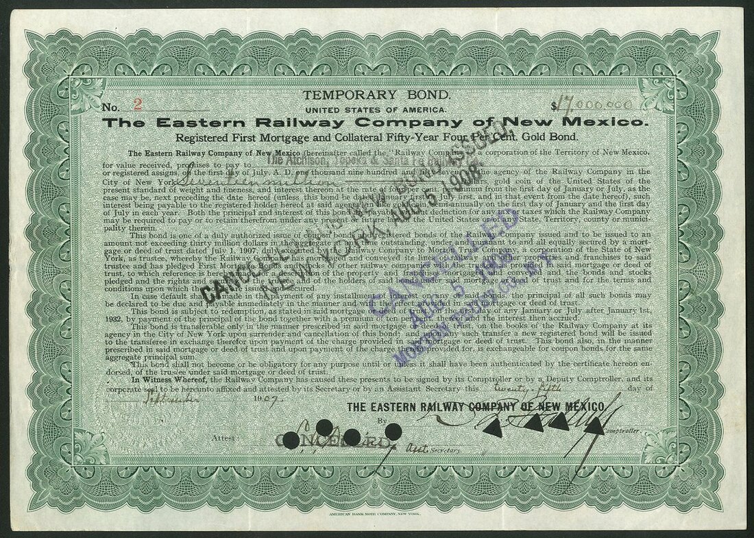 (x) U.S.A.: Eastern Railway Company of New Mexico, Registered First Mortgage and Collateral 50-Year 4% Gold Bonds, a pair of temporary bonds, each for $17,000,000, the first, #1, stamped NOT ISSUED and without signatures, the 2nd, #2, dated 19[07], for the same amount, hole and stamped cancelled. These may be the only examples extant due to their very high value - NOT IN COX. The total issue was capped at $30 million. New bonds were issued in their place in 1908 which have also not been seen; together with Santa Fe, Raton and Des Moines Railroad Co., 1st Mortgage bond, $1000, brown, with coupons, and, Tucumcari and Memphis Railway Co., 1st Mortgage registered bond, $10,000, 1909, #3, steam train, green, hole cancelled. Generally VF and better (4).