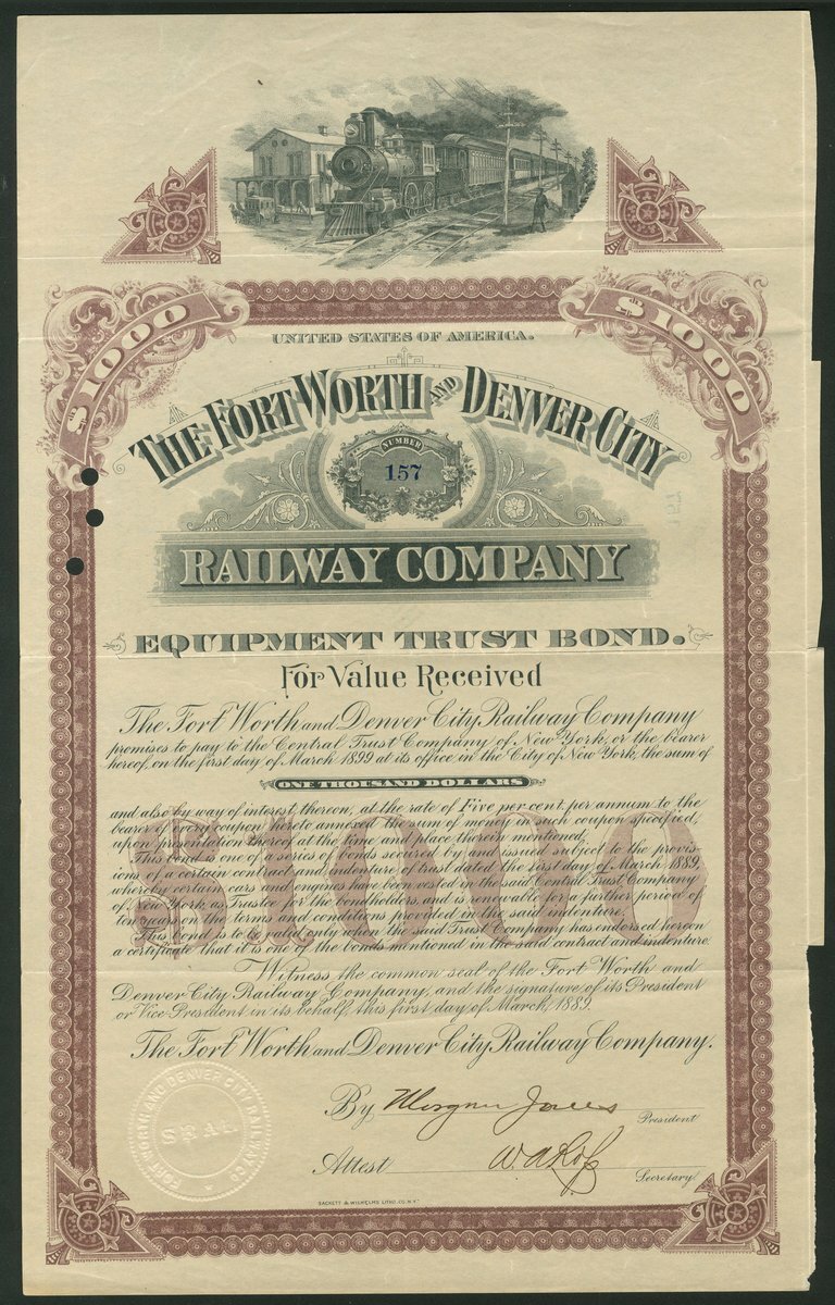 (x) U.S.A.: Fort Worth and Denver City Railway Company, 5% Equipment Trust Bond, $1000, 1889, #157, steam train at top, brown and black, Sackett & Wilhelms Litho Co., no coupons remain, hole cancelled. VF and scarce.
